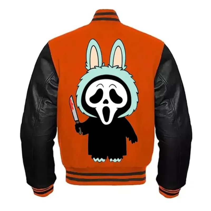 The Halloween Ghostface Labubu Varsity Jacket is a mix of spooky cool and classic varsity jacket, which is a must-have item in the wardrobe of the wearers who like to have fun in the street. This jacket is made to suit both genders, and the mischievous spirit of Labubu is celebrated with the chilling Ghostface twist making the outerwear the best item to wear during Halloween and beyond. Constructed of a wool body and real leather sleeves, it offers longevity, warmth and a two-tone varsity appearance. The lining is made of soft viscose that provides comfort and you can wear it easily either during the day or during the night.