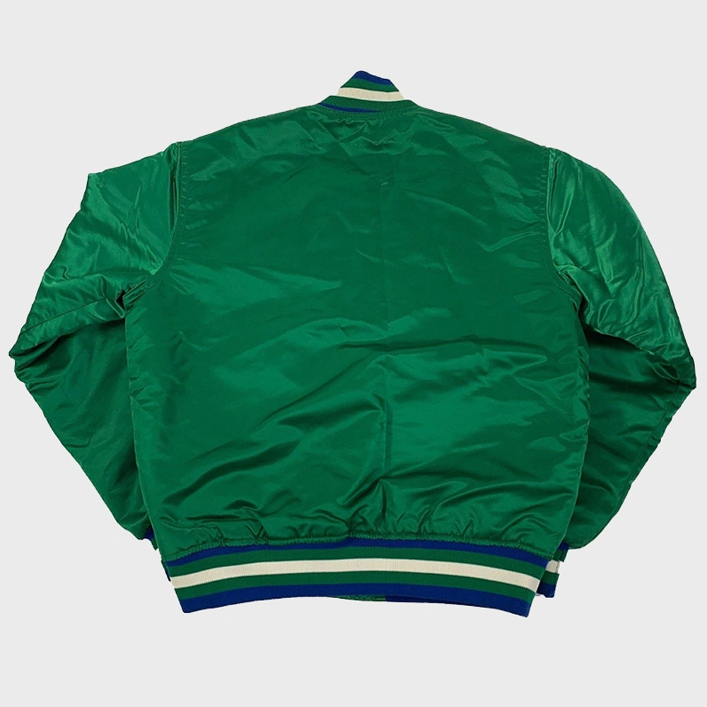 Made from satin material, the jacket’s color is blue and green which are traditional team colors of the Whalers. The collar with ribs makes it stylish yet comfortable and the front snap tab closure provides wearer comfort and a perfect fit. Having a long sleeve for the appropriate coverage and warmth, this Hartford Whalers 90’s jacket has rib-knitted cuffs that bring in sporty element to the packaging.