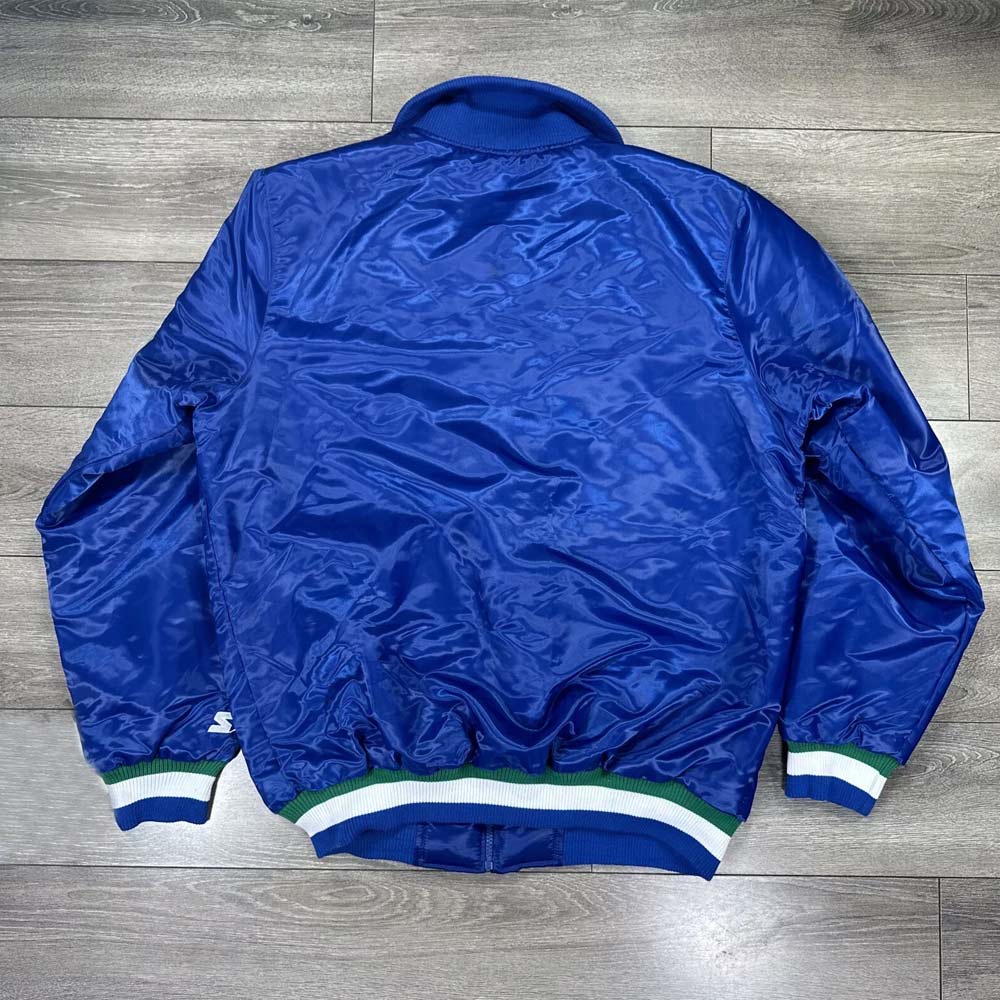 There is a zipper closure at the front which is both functional and stylish and the ribbed cuffs and hemline give the piece a comfortable fit. Long sleeves with logo patches on the sleeves give the Hartford Whalers Blue satin Jacket a sporty flair and a more interesting touch. There are two slanted waist pockets, and two inner pockets, yet the design doesn’t look too bulky due to the sleek cut.