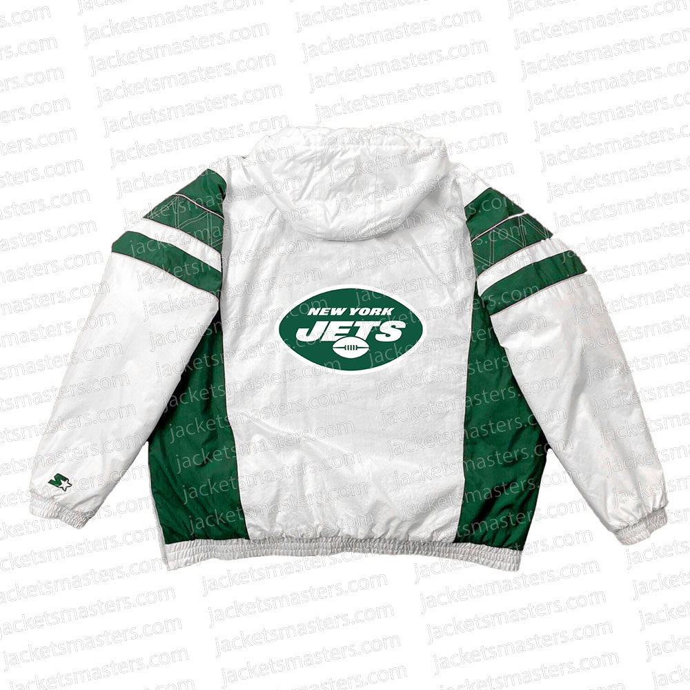 Equipped with two pockets outside, it offers practicality without compromising on style. The fine stitching speaks volumes of our commitment to quality, ensuring every detail is impeccably crafted. Adding a touch of sportsmanship is the iconic New York Jets logo adorning the front and back, celebrating the spirit of athleticism and urban charm. Elevate your wardrobe with this Home Team New York Jets White Half-Zip Jacket, where metropolitan vibes meet timeless elegance.
