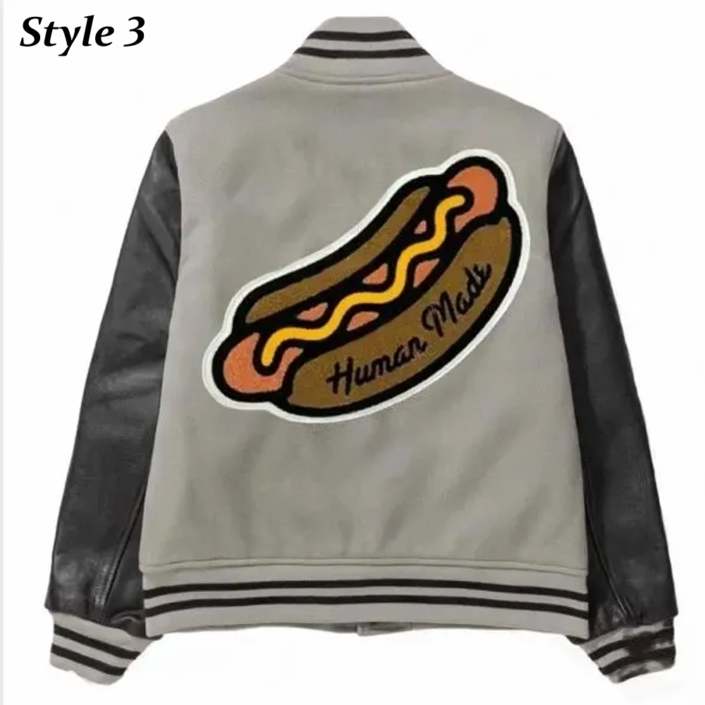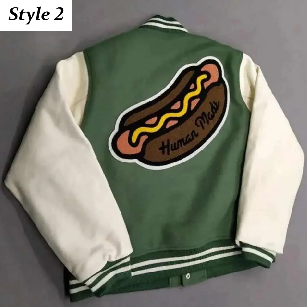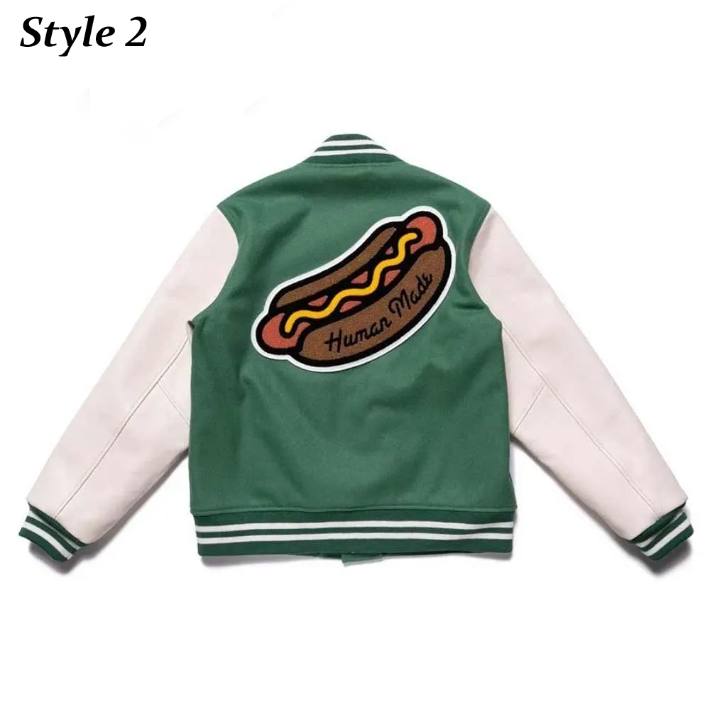 The Human Made green varsity jacket is made from high-quality wool and sleeves made from genuine leather. The jacket is available in a majestic green color, which gives it an innovative and enchanted look. The collar of the jacket is a rib-knitted style. It has a classic snap tab buttoned front closure. A soft viscose inner lining of the jacket keeps you warm and relaxed. The sleeves of the Human Made hot dog varsity jacket are full-length ends with rib-knitted cuffs. The jacket has two side waist pockets for keeping stuff. The jacket has “Human Made” logo on the back of the jacket. The fine quality stitching of the Human Made green varsity jacket makes it durable and comfortable to wear. The jacket is an ideal choice for stylish men.