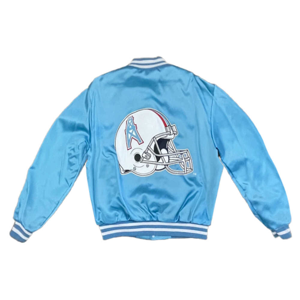 The Houston Oilers emblem is visible on the chest as well as on the back of the 90s Houston Oilers light blue jacket. These retro emblems create a sense of nostalgia, as well as passion and it will be ideal for fans and enthusiasts.