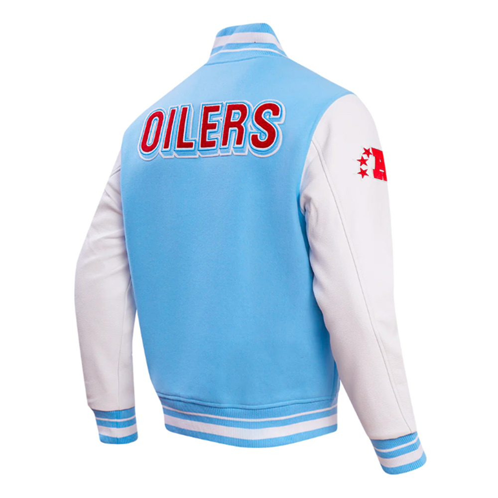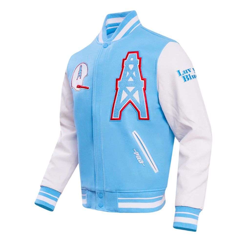 Houston Oilers Oil Derrick University Blue and White Wool/Leather Varsity Jacket