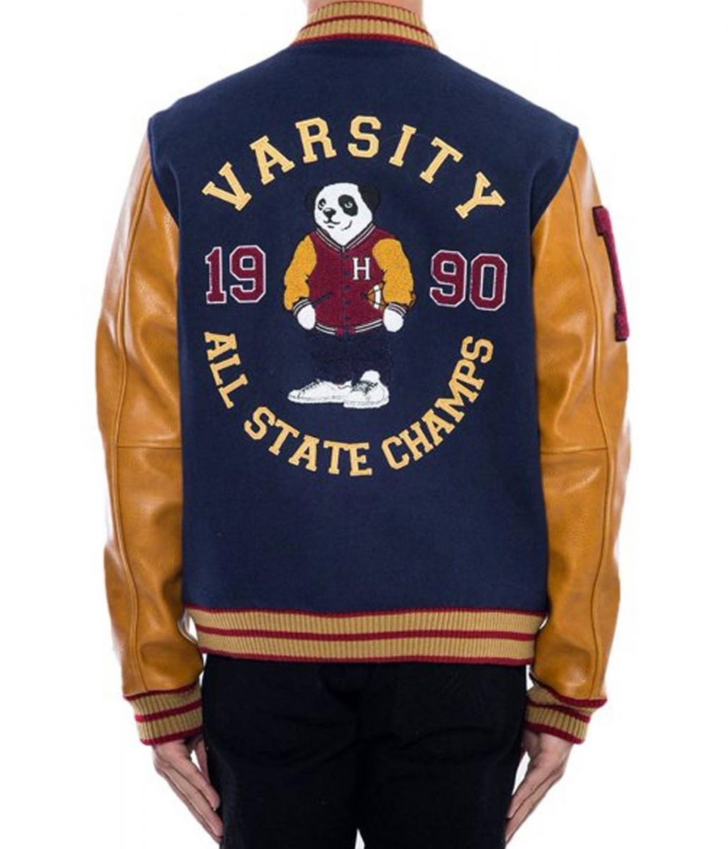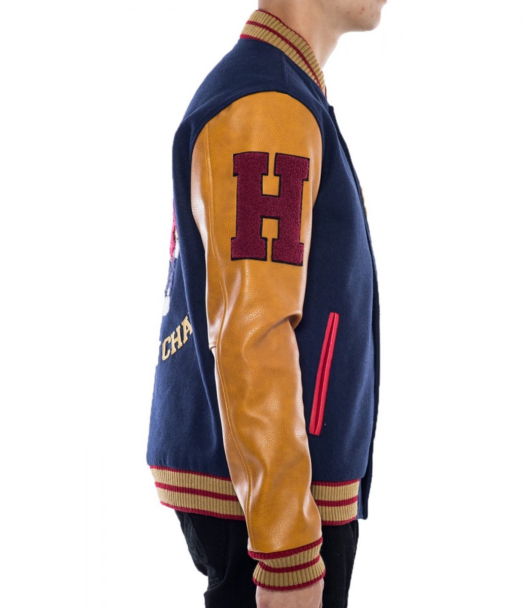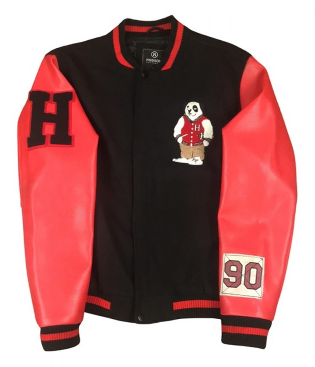 Hudson Panda Varsity jacket body made from wool and sleeves made from genuine leather. The jacket is available in glorious navy blue and brown, red and black color combination, which gives it innovative and attractive look. The collar of the jacket is rib knitted style. It has a classic snap tab buttoned front closure. A soft viscose inner lining of the jacket keeps you warm and relaxed. The sleeves of Panda Hudson Navy Varsity jacket are full-length ends with fitting. The jacket has two side waist pockets for keeping stuff. The fine quality stitching of Hudson Panda Varsity jacket makes it durable and comfortable to wear. The jacket is an ideal choice for stylish men and women.