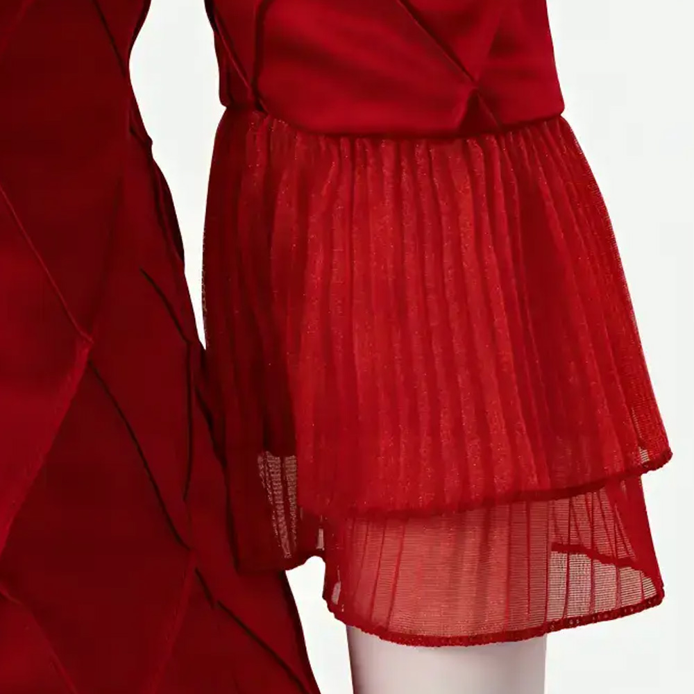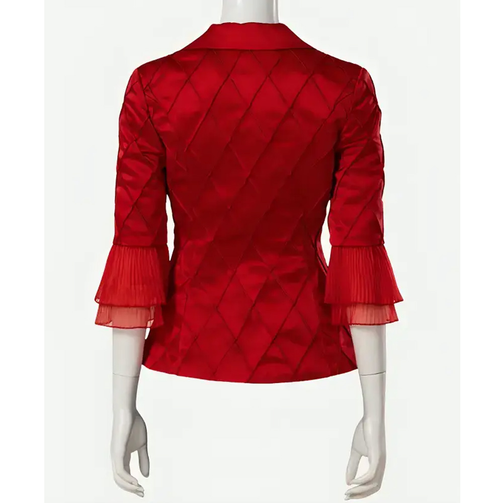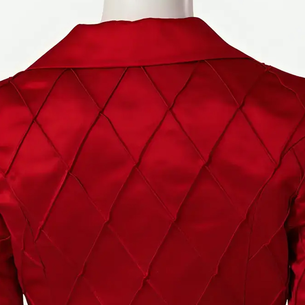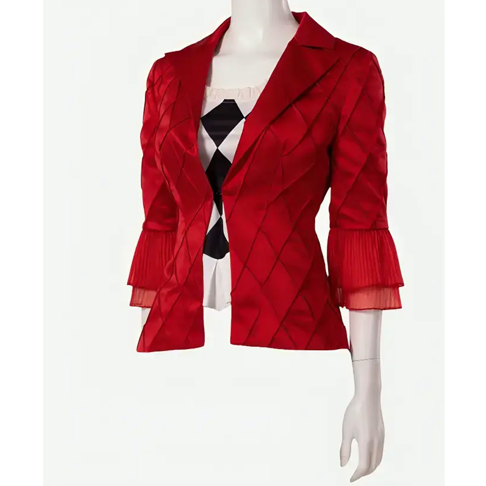 On the inside, there is a viscose lining that gives it a perfect touch on the skin and you will enjoy the looks and feel of it. The collar of the Joker 2 Harley Quinn red blazer follows a lapel style, which is a very traditional style to incorporate and the hook closure in the front makes the design very neat and stylish. There are long sleeves that have a frilled finish and the design gives it that playful feel which complements the dramatic feel.