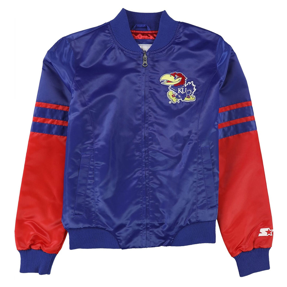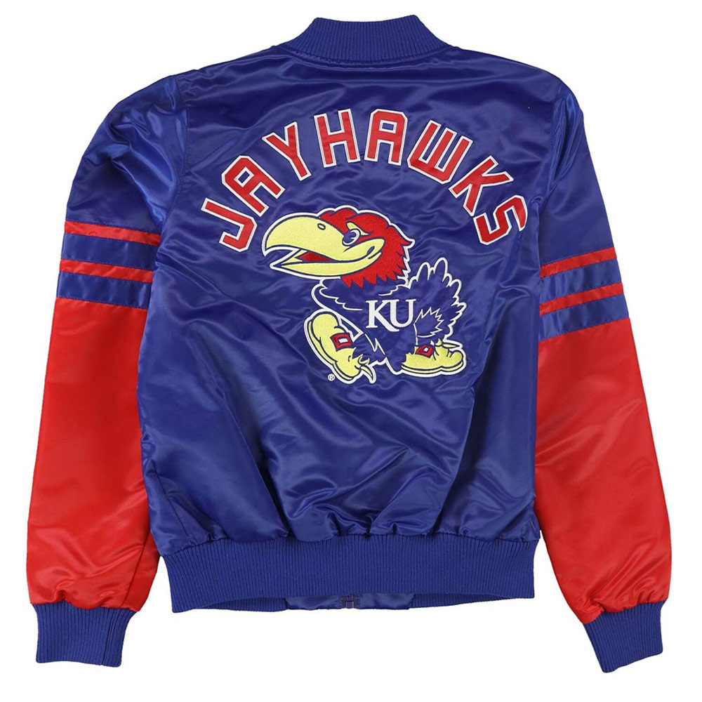 Explore the legacy of distinction with the iconic Kansas Jayhawks Blue and Red jacket. Meticulously tailored from premium-grade satin, its fusion of glorious blue and red color exudes innovation, casting a mesmerizing allure. The rib-knit collar and snap-tab buttoned front closure seamlessly marry function with haute couture, reshaping your style narrative. Wrap yourself in the lavish cocoon of the viscose inner lining, cocooned in lavish comfort. Elongated sleeves, adorned with sleek rib-knit cuffs, bestow an enchanting touch, elevating your grace to unprecedented heights. Enhanced by an inner pocket and two outer pockets, the Kansas Jayhawks Blue and Red jacket epitomizes practical refinement. Indulge in unmatched comfort and allure, as meticulous stitching pays homage to the craftsmanship of impeccable artistry. This Kansas Jayhawks Blue and Red jacket symbolizes sophisticated gatherings, embodying your vibrant spirit and establishing a novel benchmark for trendsetting brilliance.
