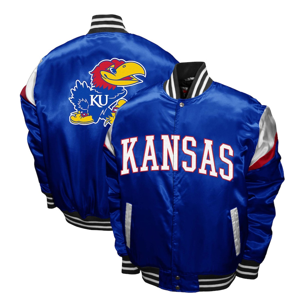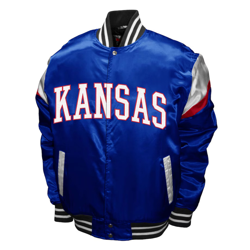The collar is ribbed for an athletic look that goes well with the having a front zipper with snap placket fastening for a smart and secure fit. The long fitted sleeves have striping for an athletic look that complements the rest of the garment. The cuffs and the bottom of the Kansas Jayhawks Power Powder Royal satin Jacket are ribbed which make it comfortable to wear.