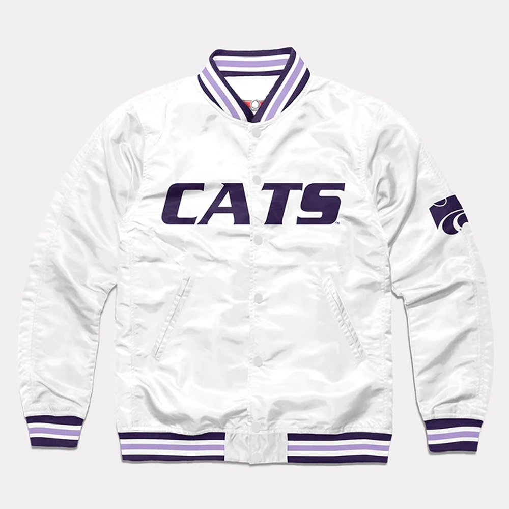 Submerge yourself in the legacy of brilliance epitomized by the iconic Kansas State Cats jacket. Crafted with meticulous artistry, its premium satin composition exudes innovation, radiating captivating charm through its glorious white color. The seamless integration of a rib-knit collar and snap-tab buttoned front closure harmoniously blends function with haute couture, redefining your style with an unparalleled panache. Draped in the embrace of a lavish viscose inner lining cocooned in opulent comfort, you experience a world of luxurious indulgence. Elongated sleeves, adorned with sleek rib-knit cuffs, elevate your grace to extraordinary heights, infusing an air of sophistication. Enriched with an inner pocket and two outer pockets, the Kansas State Cats White Satin jacket epitomizes practical elegance. A symbol of sophistication at gatherings, this Kansas State Cats jacket reflects your vibrant spirit, setting an unmatched benchmark for trendsetting brilliance—a true emblem of your distinctive style odyssey.