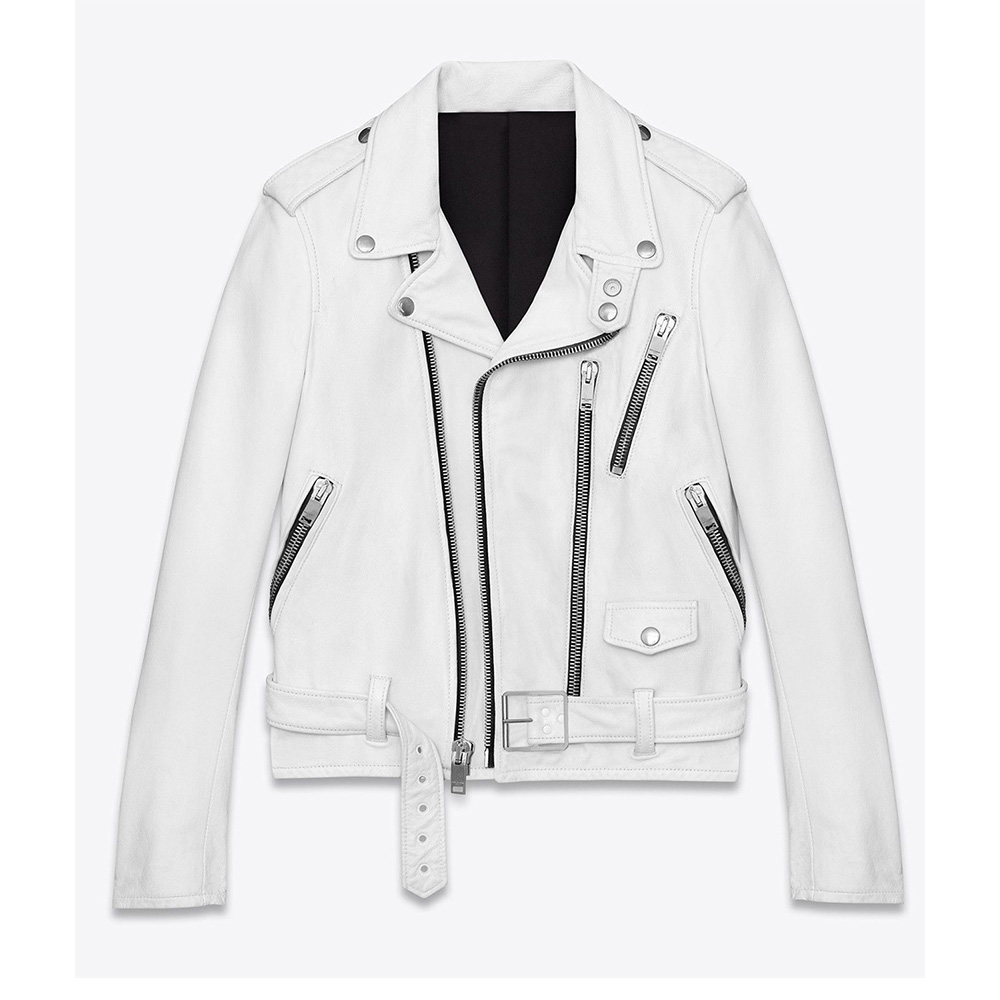 Realm of reality and fashion with the Khloe Kardashian White Leather Jacket, as seen in the iconic TV series “Keeping Up with the Kardashians.” Khloe Kardashian effortlessly embraced this jacket, crafted from luxurious gray satin that exudes a sense of opulence. The lapel-style collar and the front adorned with a branded YKK zipper closure epitomize sophistication and modernity. Long sleeves with zipper cuffs add a contemporary touch to this timeless piece, ensuring a snug and stylish fit. Inside, the plush viscose lining guarantees a feeling of indulgent comfort. This iconic garment is not only a fashion statement but also a functional one, featuring two side pockets and one inner pocket for your convenience. The meticulous craftsmanship and fine quality stitching ensure durability, making the Khloe Kardashian White Leather Jacket a cherished addition to your wardrobe.