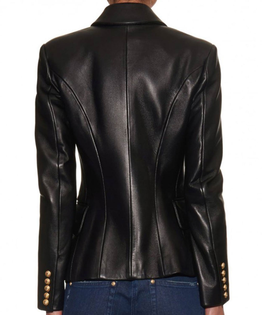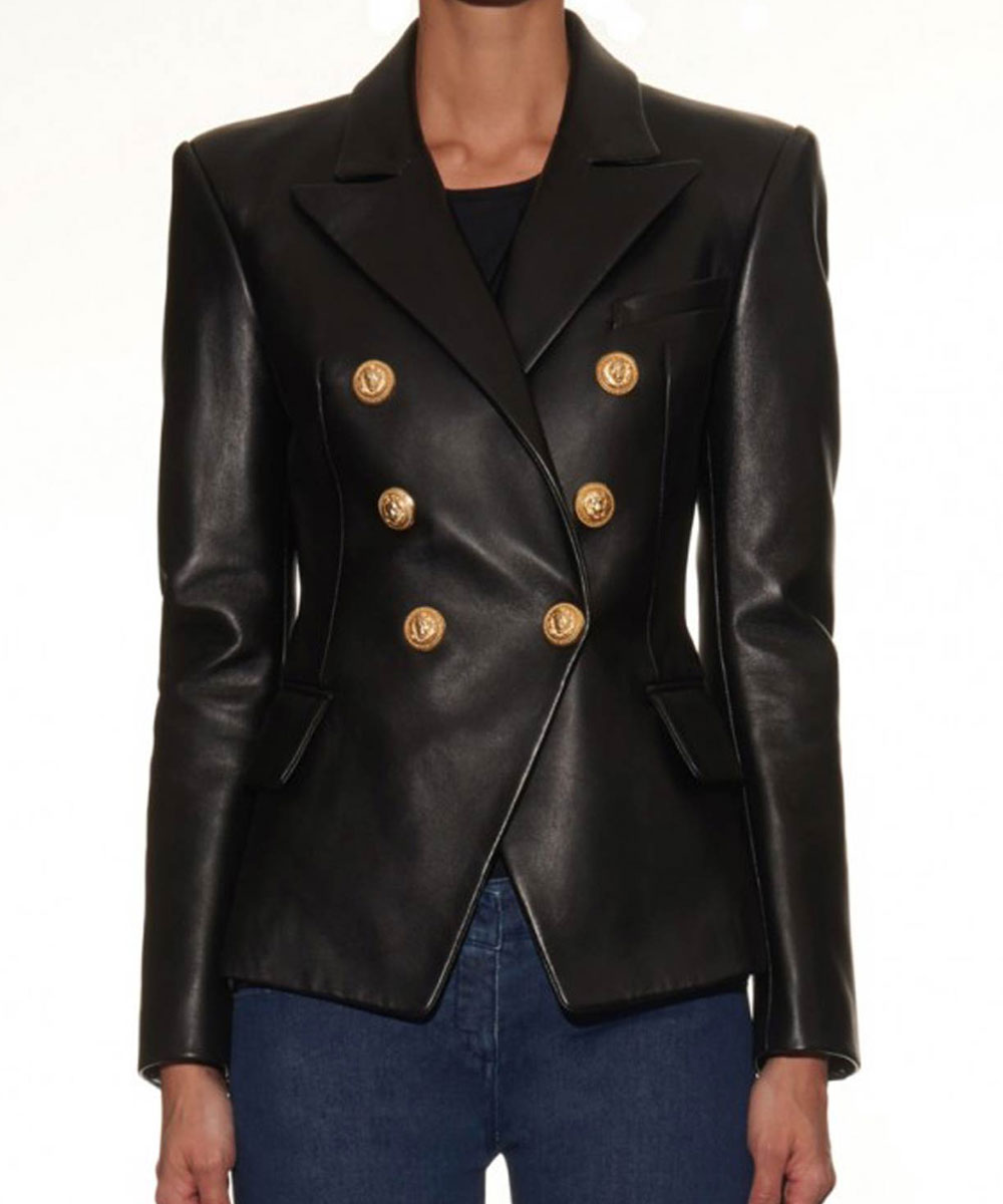 The Kim Kardashian leather jacket is made from high-quality genuine leather or faux leather. The jacket is available in a mesmerizing black color. The collar of the jacket is lapel style. It has a double-breasted golden buttoned front closure. A soft viscose inner lining of the jacket keeps you warm and relaxed. The sleeves of the Kim Kardashian double breasted leather jacket are long and have open hem cuffs. There are two flapped pockets at the waist for keeping stuff. The fine quality stitching of the Kim Kardashian leather jacket makes it durable and comfortable to wear. The jacket is a perfect look for a get-together or party.