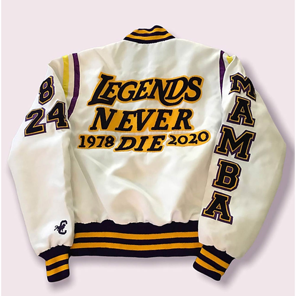The Kobe Bryant White jacket is made up of high-quality wool. The jacket is available in a glorious white color, which gives it an innovative and attractive look. The jacket has rib knitted collar. The jacket has buttoned front closure. A soft inner viscose lining of the jacket keeps you warm and relaxed. The sleeves of Kobe Bryant Mamba Legend Never Die White Varsity jacket are long with rib knitted cuffs. The jacket has two inner and two side pockets. The fine quality stitching of Kobe Bryant White jacket is comfortable and desirable to wear. The jacket is an ideal choice to wear in parties.