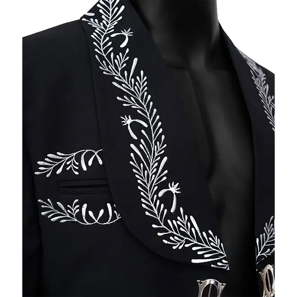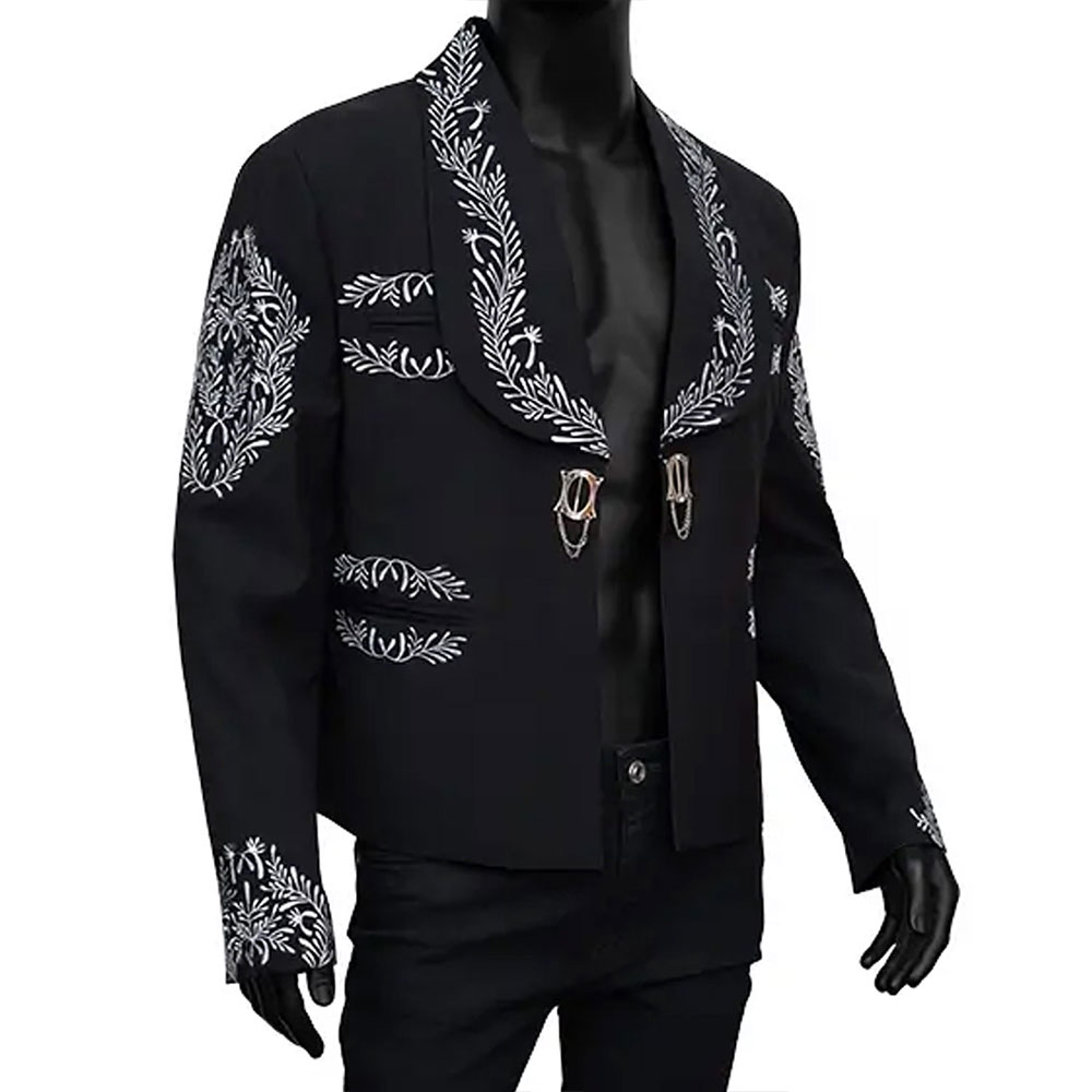 The Joe Kelly Mariachi Jacket features a striking black color that symbolizes strength and determination. Its lapel-style collar and unique hook-and-eye closure provide a refined silhouette, while the intricate embroidery across the chest, sleeves, and back captures the artistry of mariachi culture. Long, fitted sleeves with open hem cuffs and fine-quality stitching ensure this jacket balances aesthetics with durability.