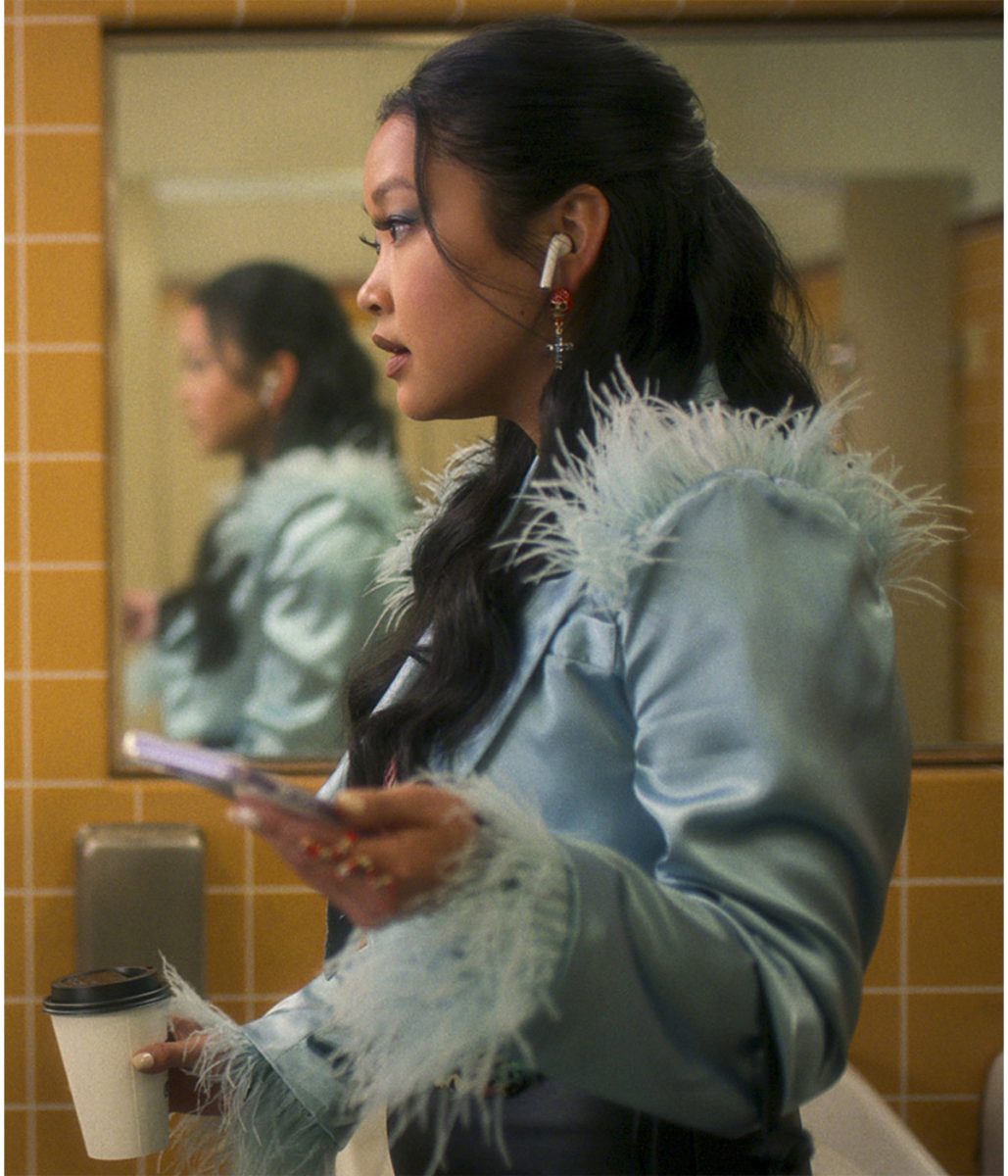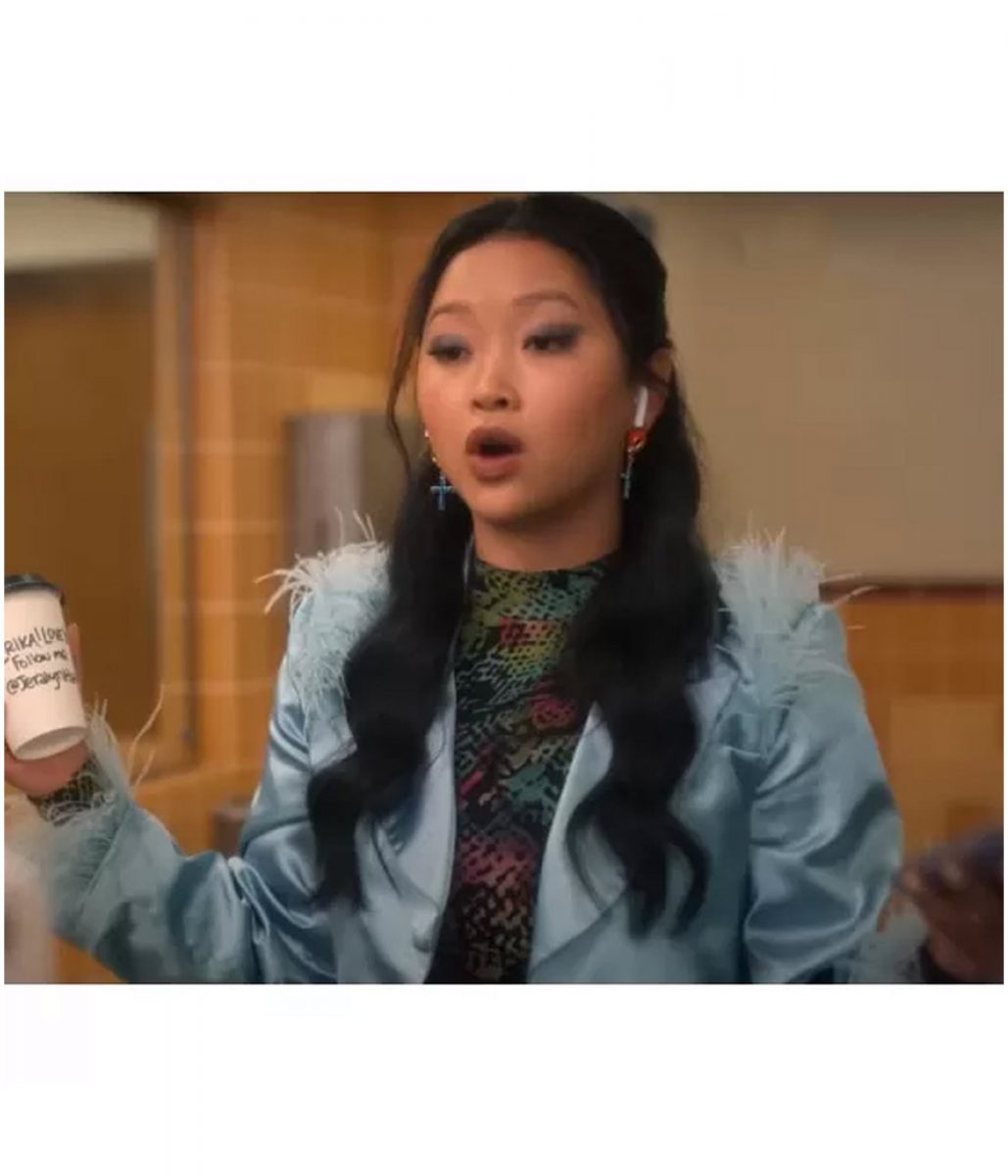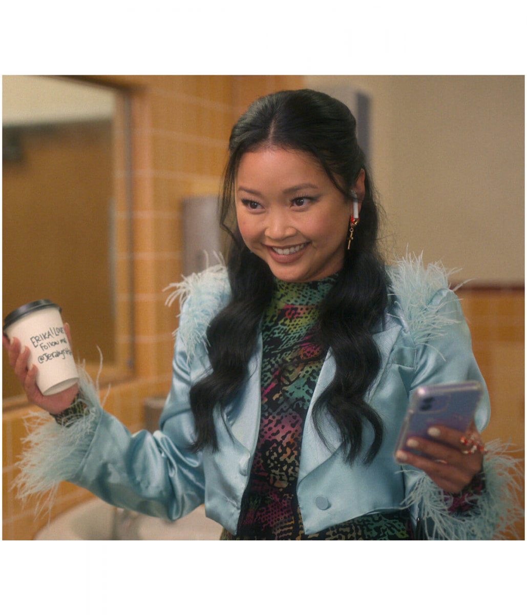 Lana Condor Boo Bitch Erika Vu Blue Cropped Satin Jacket