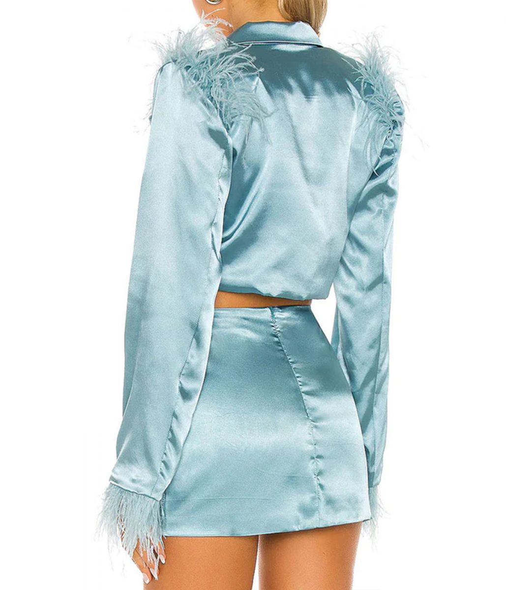 The Erika VU blue jacket is made from high-quality satin. The jacket is available in a glorious blue color, which gives it an innovative and attractive look. The collar of the jacket is lapel style. It has a classic buttoned front closure. A soft viscose inner lining of the jacket keeps you calm and relaxed. The sleeves of the Lana Condor Boo Bitch cropped jacket are long ends with faux fur cuffs. The jacket has one inside pocket and two side waist pockets for keeping stuff. The fine quality stitching of the Erika VU blue jacket makes it durable and desirable to wear. The jacket is an ideal choice for date wears.