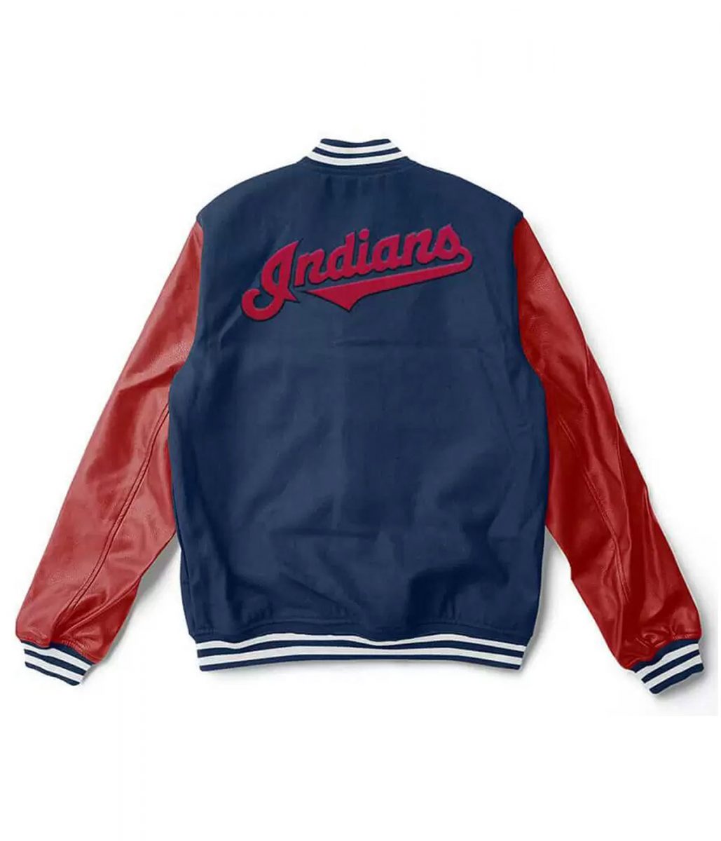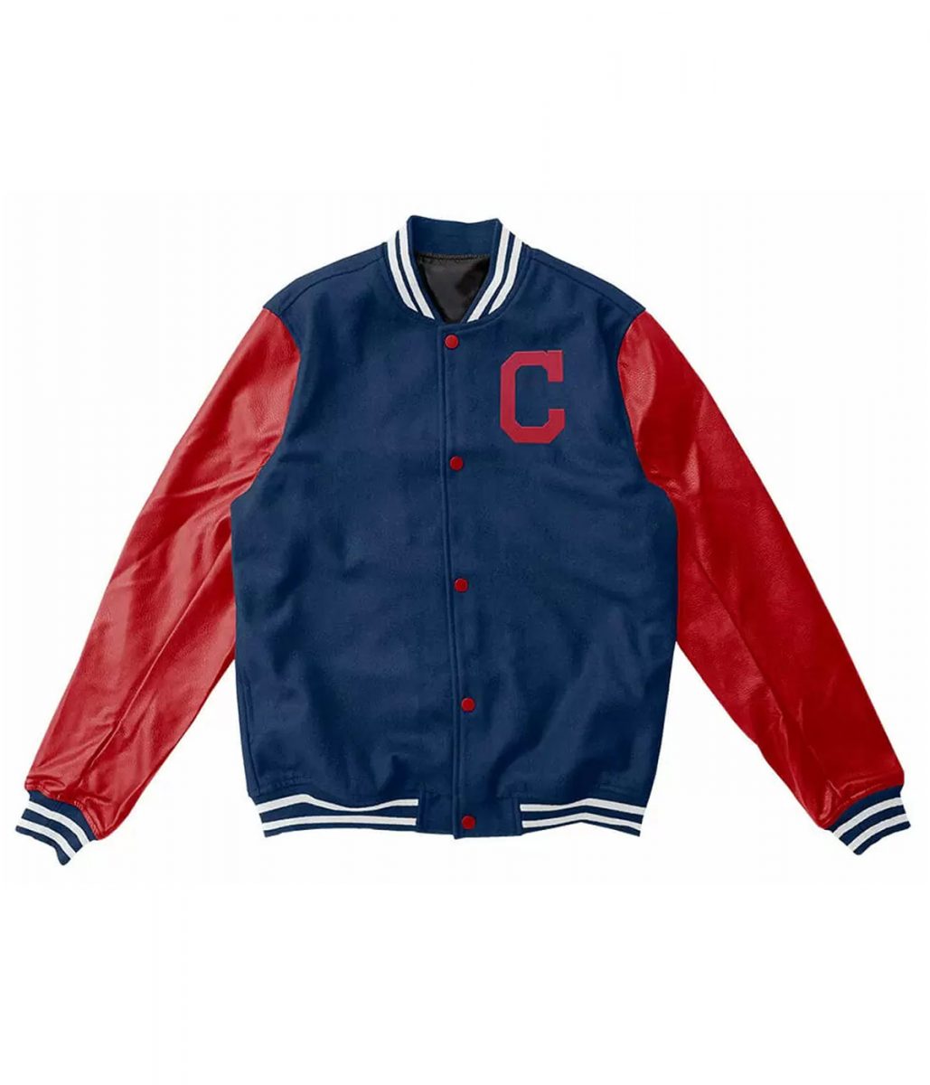 The Cleveland Indians red and blue varsity jacket Body made from wool and sleeves made from genuine leather. The jacket is available in blue and red color contrast giving it an attractive and chic look. The collar of the jacket is rib-knitted style. It has a classic snap tab buttoned style front closure with rib knitted hemline. A soft viscose inner lining of the jacket helps you to feel calm and pleasant. The sleeves of the Cleveland Indians letterman red and blue jacket are full length with rib-knitted cuffs. The jacket has two side waist pockets for keeping valuable products. The fine quality stitching of the Cleveland Indians red and blue varsity jacket makes it comfortable and desirable to wear. The jacket is perfect choice for sport lovers and a stylish man.