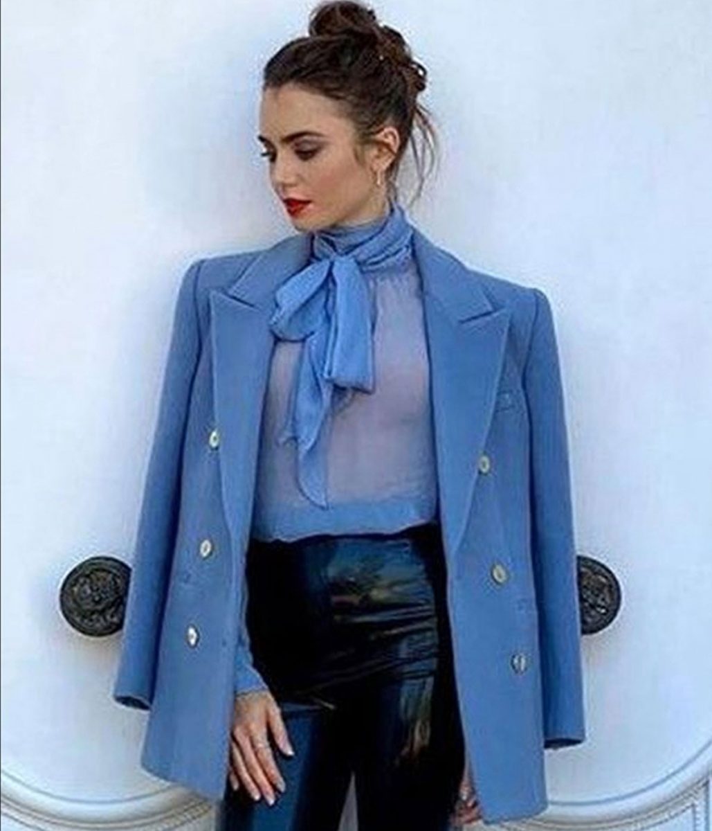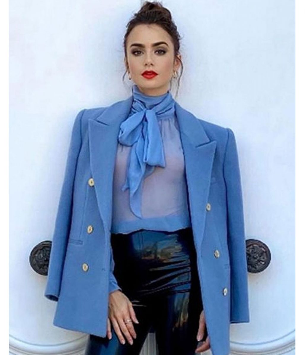 The Emily Cooper peacoat is made from high-quality wool blended material. The coat is available in a glorious blue color which gives it an innovative and attractive look. The collar of the coat is peak lapel style. It has a buttoned front closure. A soft viscose inner lining of the coat keeps you warm and relaxed. The sleeves of the Emily in Paris Lily Collins blue peacoat are long ends with open hem cuffs. The coat has two front pockets and two inside pockets for keeping stuff. The fine quality stitching of the Emily Cooper peacoat makes it durable and comfortable to wear. The coat is an ideal choice for parties.