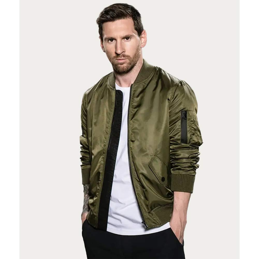 Unleash your style with the Lionel Messi Bomber jacket, meticulously crafted from premium quality satin. Its captivating green creates an innovative and enchanted visual appeal that is simply stunning look. This Lionel Messi Green Bomber jacket features a classic rib knitted collar and a branded YKK zipper front closure, marrying elegance with convenience. The soft viscose inner lining guarantees warmth and relaxation, while the long sleeves with rib knitted cuffs provide a comfortable and refined fit. With two inner and two side pockets, this Lionel Messi Bomber jacket offers practicality and functionality. The fine quality stitching ensures both comfort and desirability, making it an ideal choice for parties and events