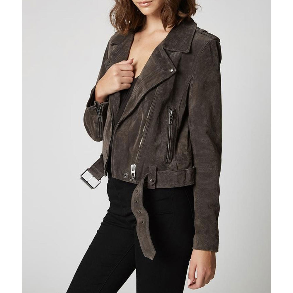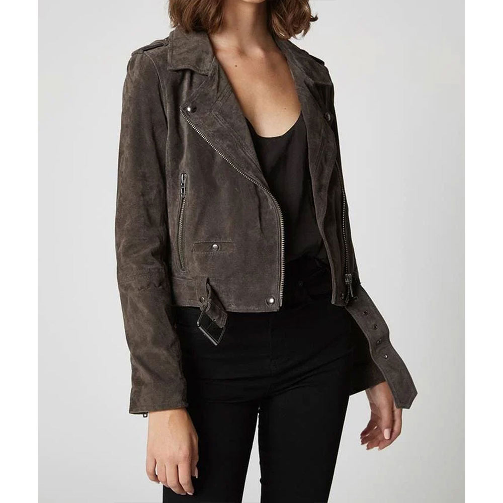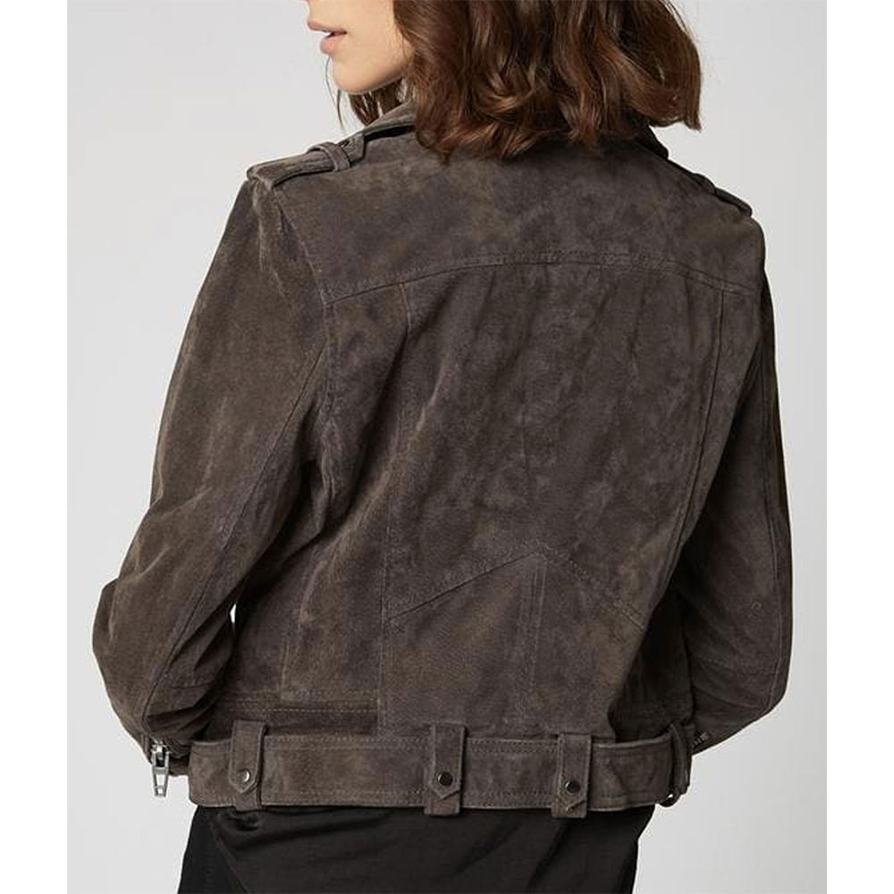 Here is the Carly Miller Jacket, which is made of suede leather with a soft viscose lining inside. The lapel-style collar enhances the alluring appearance. The zipper fastening closure of the Locke & Key Oriana Leman Jacket makes it a timeless attire that you can carry anytime. The appealing gray color makes the article classy. There are long sleeves with open hem cuffs, and the belted hemline offers you to fix it according to your choice. The waist zipper pockets outside and inside offer large spaces to keep the stuff.