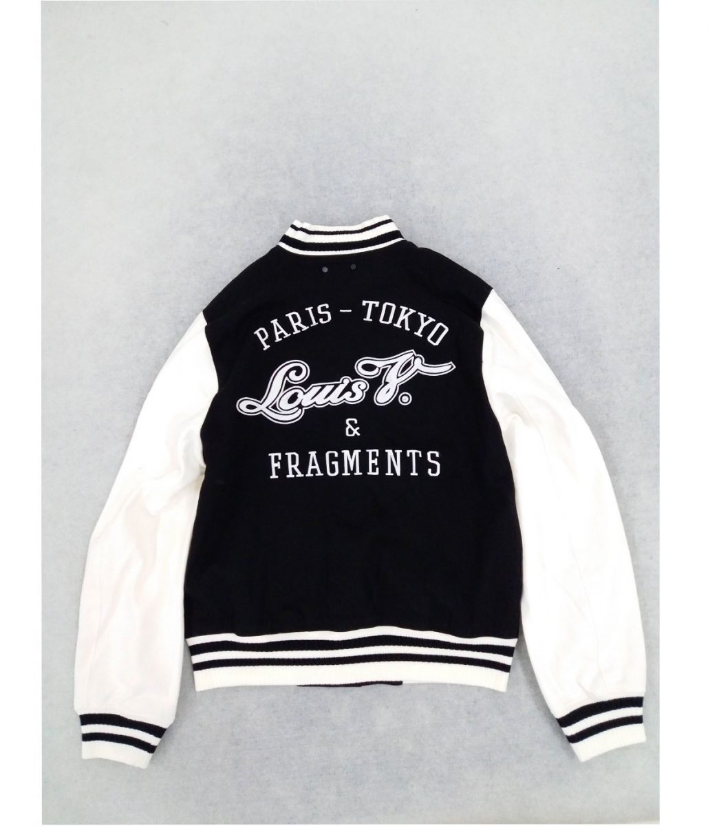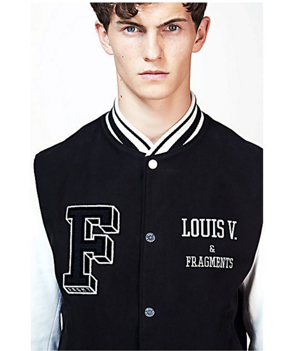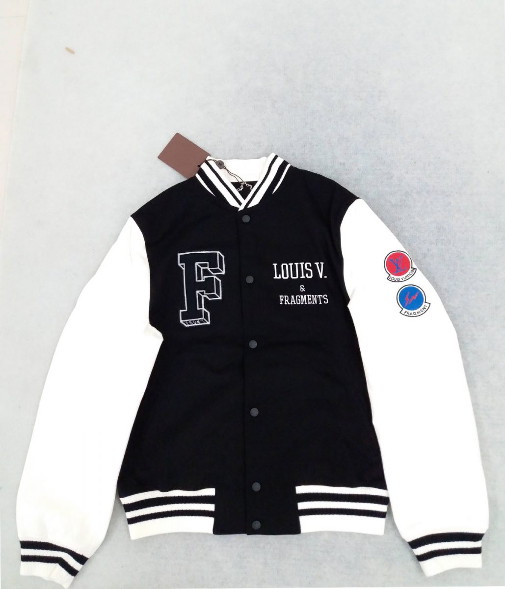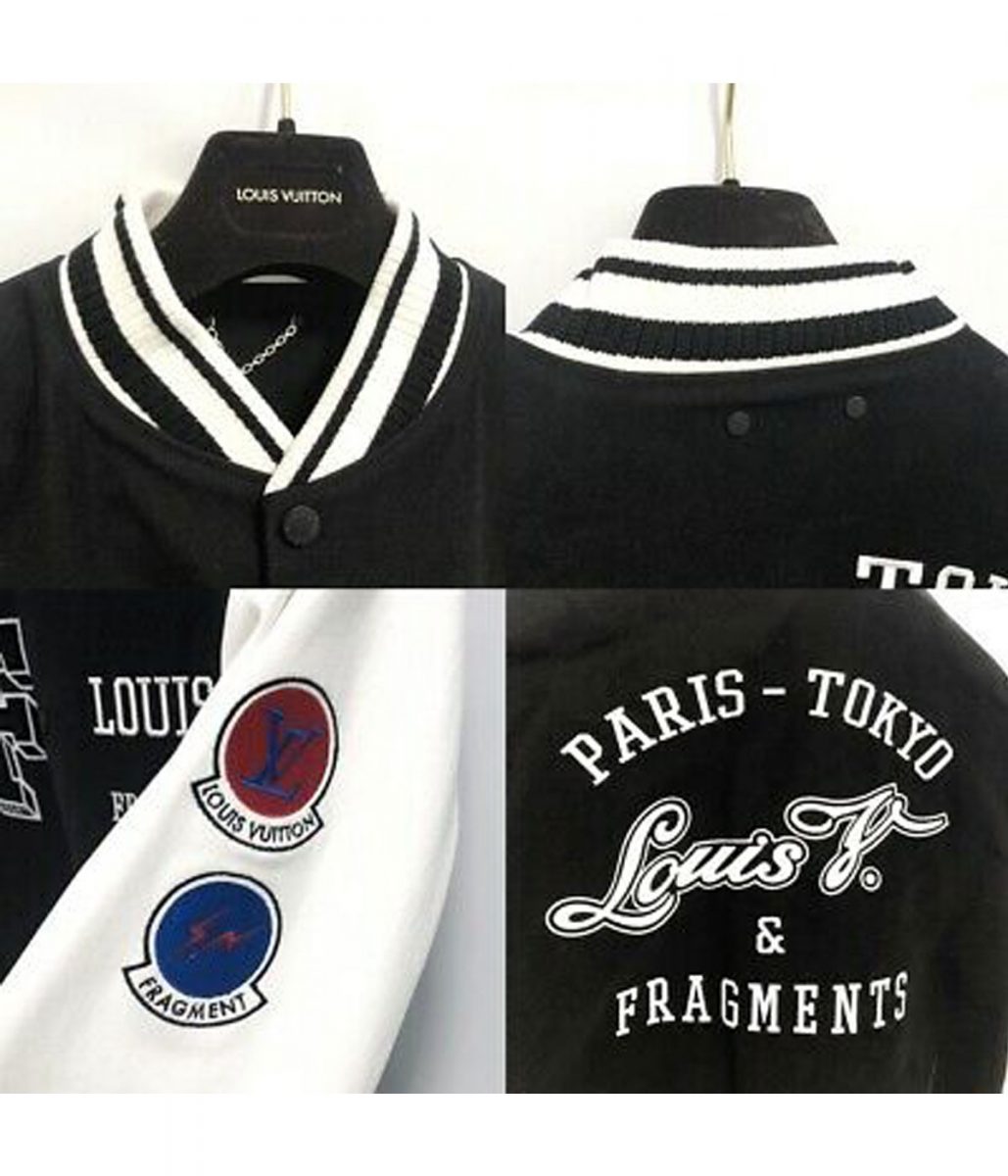 The Fragment Varsity jacket is made from high-quality wool and sleeves made from genuine leather. The jacket is available in a black and white color which gives it an innovative and enchanted look. The collar of the jacket is rib-knitted style. It has a buttoned front closure. A soft viscose inner lining of the jacket keeps you warm and relaxed. The sleeves of the Louis V & Fragment Varsity jacket are long and fitted with rib-knitted cuffs. The jacket has two side waist pockets for keeping stuff. There are embroidered and graphic patches on the front, back, and sleeves. The fine quality stitching of the Fragment Varsity jacket makes it durable and comfortable to wear. The jacket is ideal for bike riding and a night out with friends.