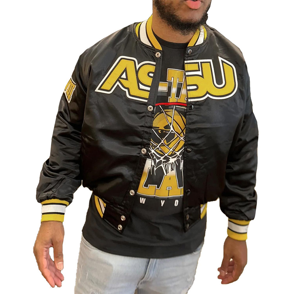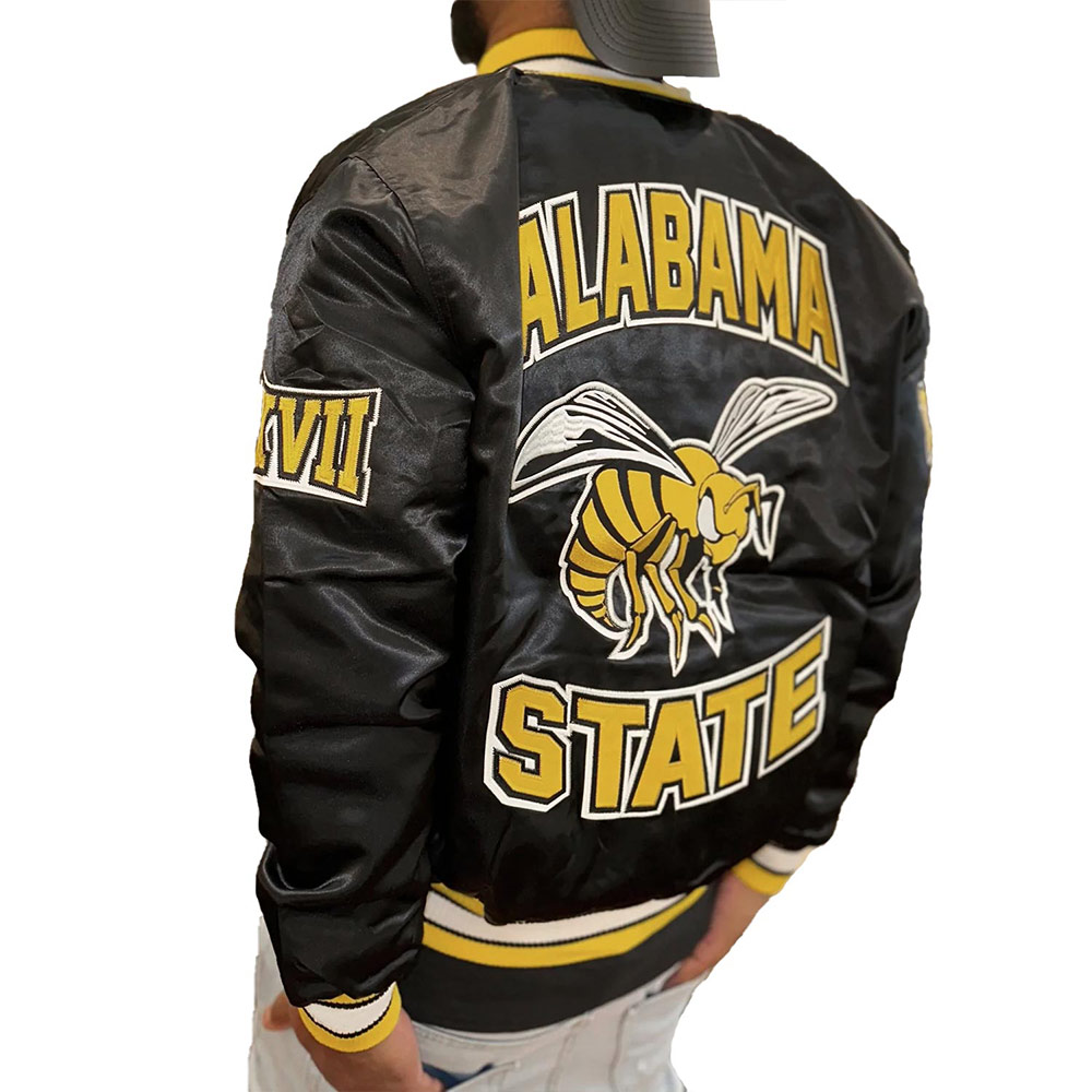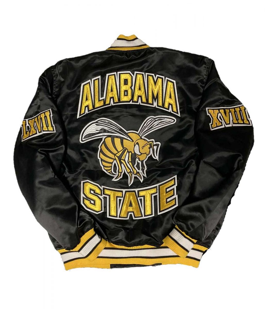 The Men’s Alabama State University jacket is made from high-quality satin. The jacket is available in a mesmerizing black color, which gives it an innovative and striking look. The collar of the jacket is a rib-knitted style. It has a classic snap tab buttoned front closure. A soft viscose inner lining of the jacket keeps you warm and relaxed. The sleeves of the Men’s Alabama State University Black Satin jacket are long ends with rib-knitted cuffs. The jacket has two side waist pockets for keeping stuff. The fine quality stitching of the Men’s Alabama State University jacket makes it durable and desirable to wear. The jacket is an ideal choice for stylish men.