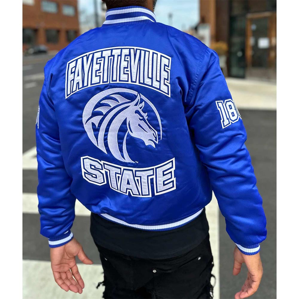 Step into the realm of Men’s Basketball at Fayetteville State with our Men’s Fayetteville State University jacket, a tribute to athleticism, resilience, and team spirit. Crafted with precision and inspired by the dynamic energy of the team, this jacket seamlessly blends performance and style for the modern sports enthusiast. Made from luxurious satin, the exterior radiates sophistication and charm, making a statement wherever you go. In a bold Royal Blue hue, this jacket reflects the team’s legacy, while the rib-knitted collar, cuffs, and hemline add a sporty edge to the classic design. Inside, you’ll discover a lavish viscose lining of Men’s Fayetteville State University Satin jacket that ensures comfort and breathability, keeping you feeling fresh and stylish from the court to the streets.
