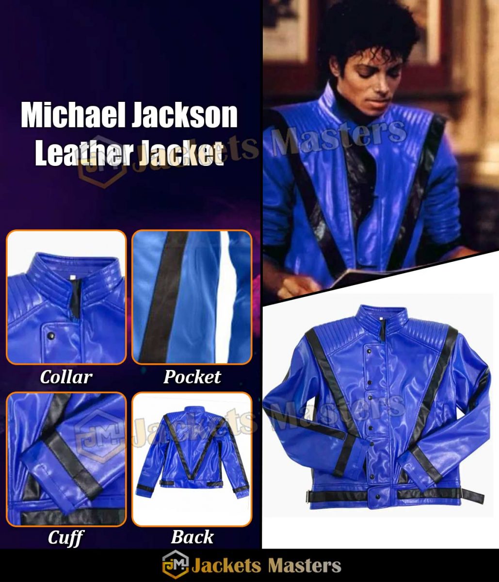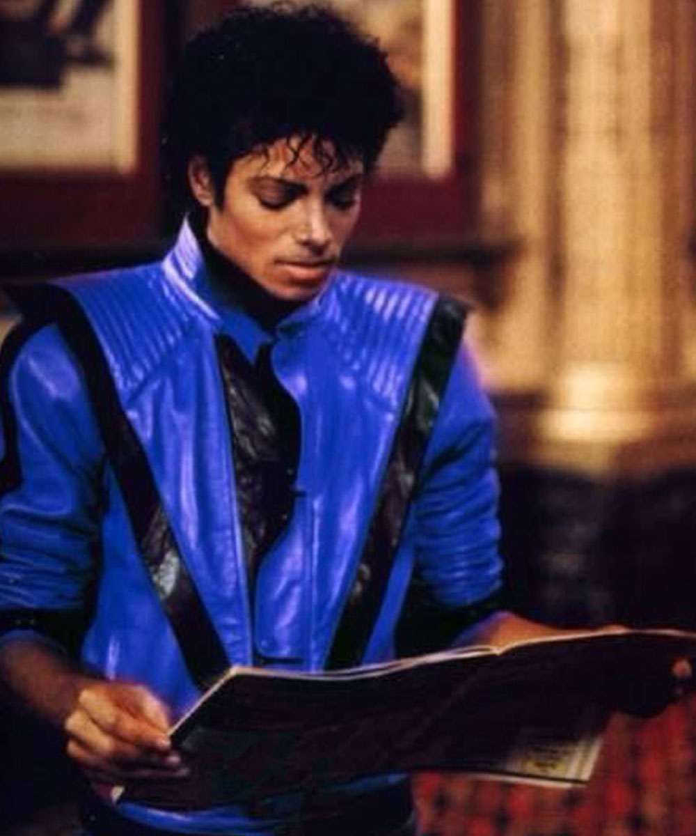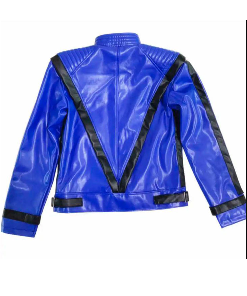 The Blue Thriller Jacket is made from best-quality genuine leather. The jacket is in stunning blue color with black stripes. The jacket has a stand-up collar and a YKK zipper closure with snap tab buttons. The sleeves of the jacket are long and fitting with belted cuffs which gives it a smart and fitted look. To keep things the Thriller Michael Jackson Blue Leather Jacket has two side waist pockets. The jacket is comfortable to wear as it has soft viscose lining on its inside. The Michael Jackson Leather Jacket is finally stitched and desired by many for its smart and fitted looks.