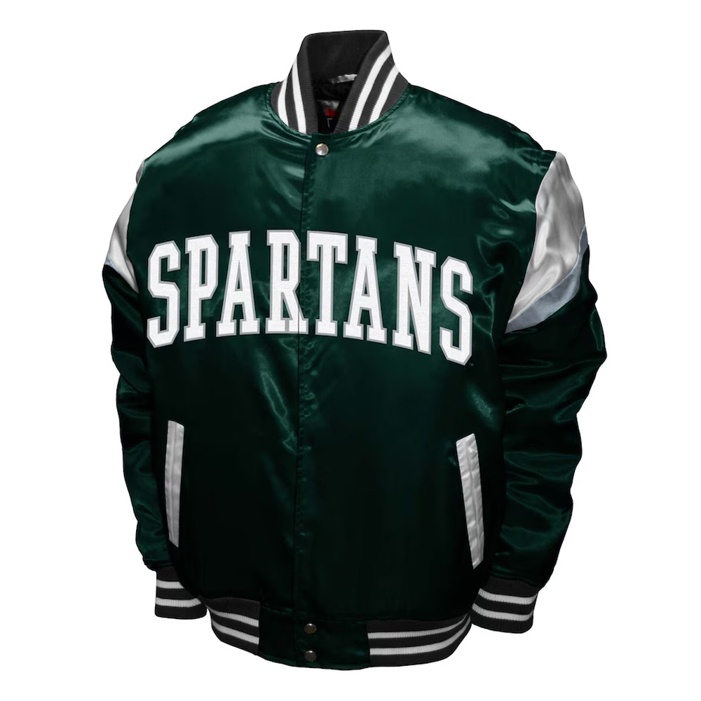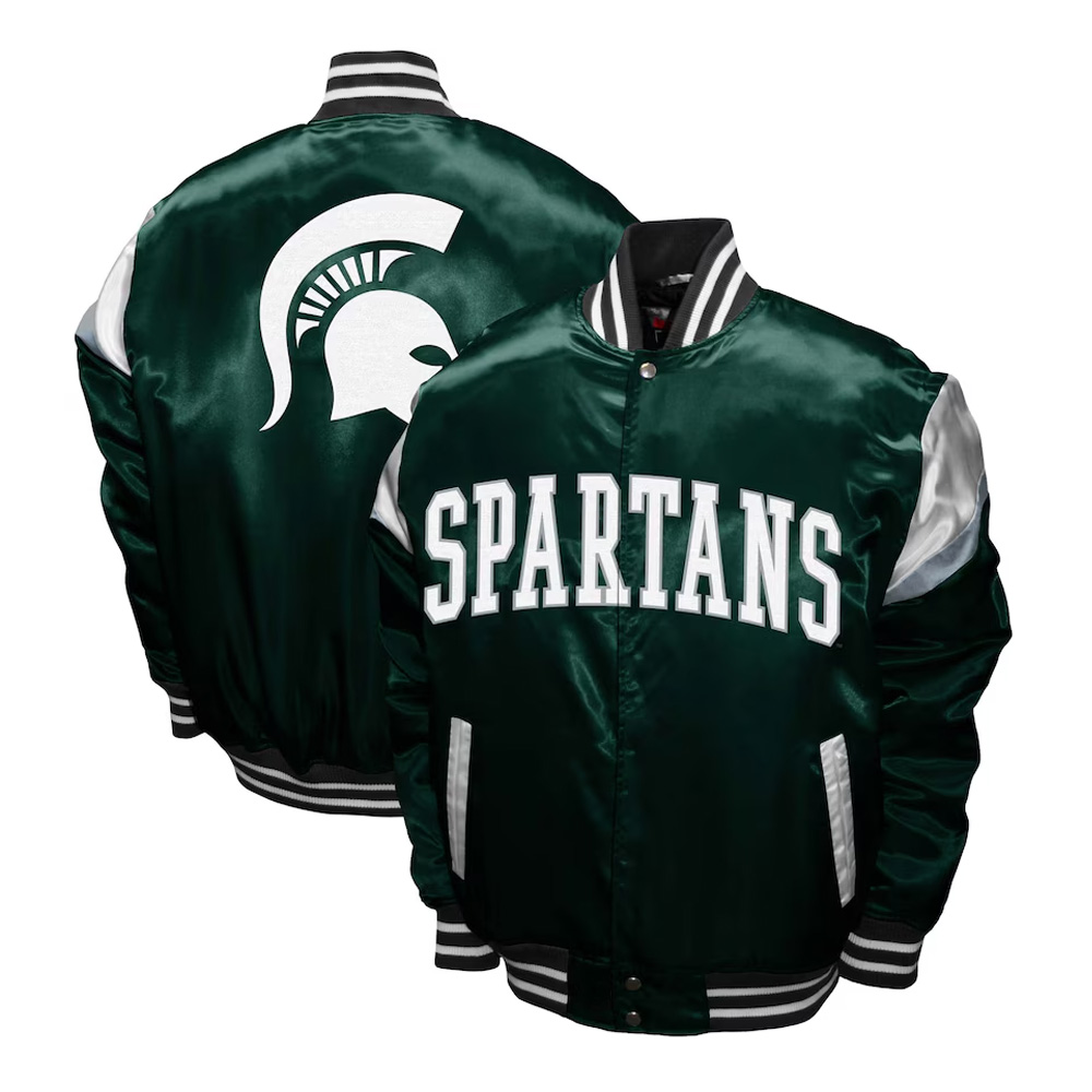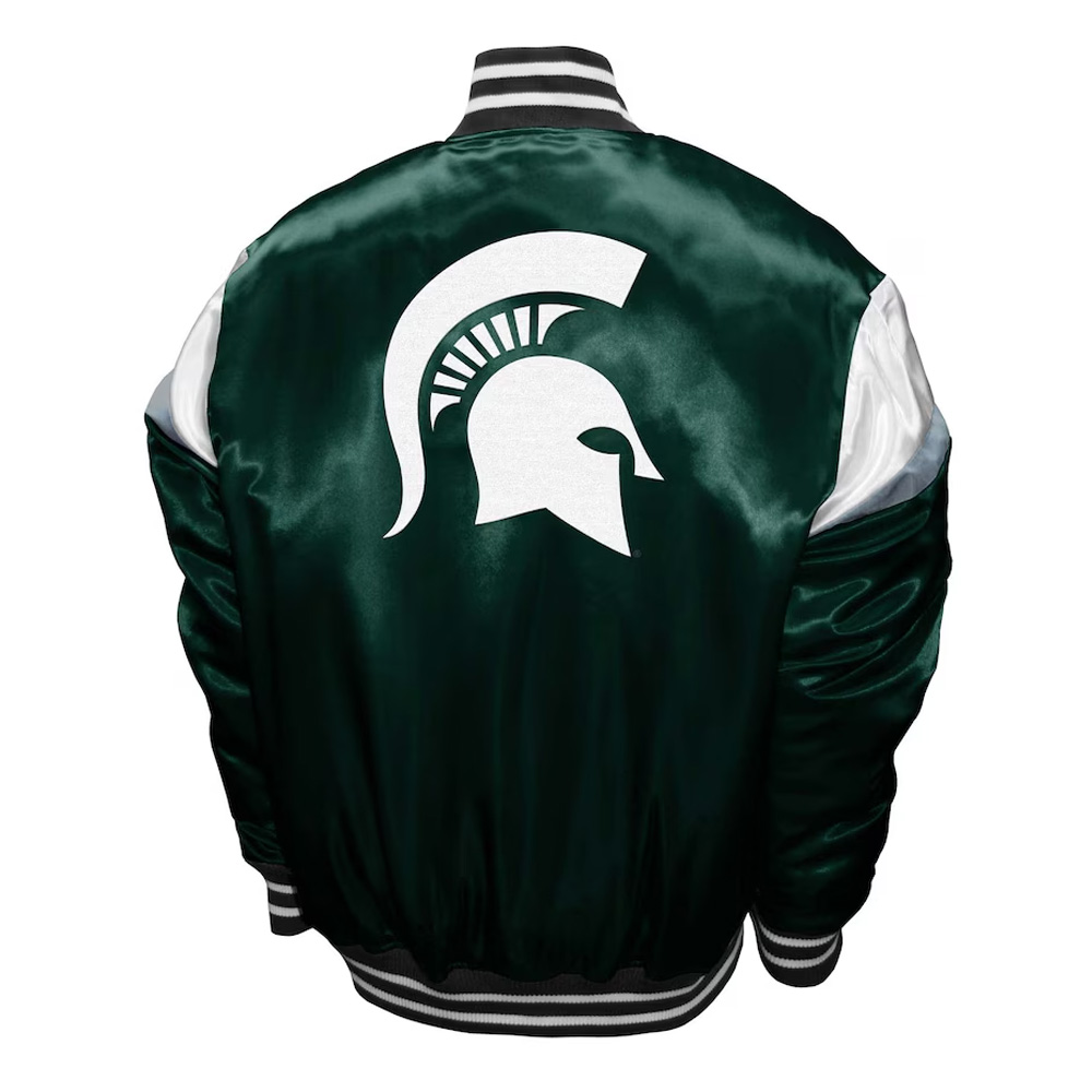 It is made from quality satin material and this jacket has a sleek finish perfect for daily wear or for sporting events. The viscose lining provides maximum comfort and warmth, thus it is perfect for cooler climates. It comes in the green color that complements the Michigan State Spartans spirit, and you will be easily noticed.