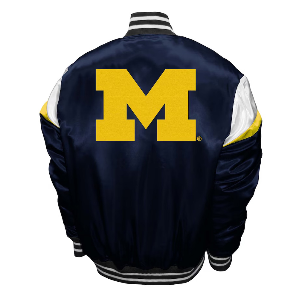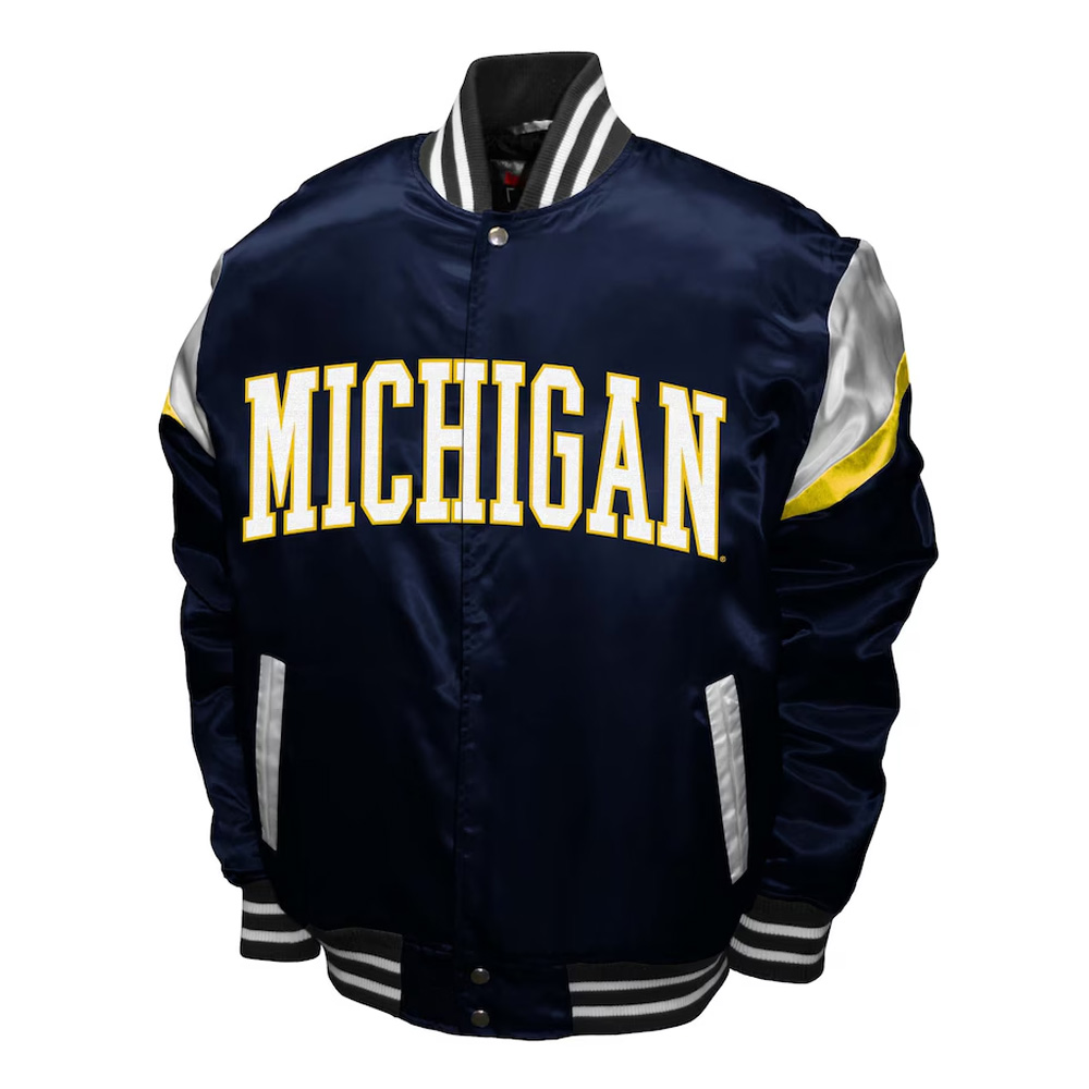 Functionality is not sacrificed for design, as it comes with two slanted waist pockets and two internal ones. The back has a unique Michigan Wolverines logo, and the front has a simple but bold “Michigan” text that tells everyone where you belong. This Michigan Wolverines Power Jacket has been stitched to perfection and has been designed to be both; functional and fashionable in equal measure.