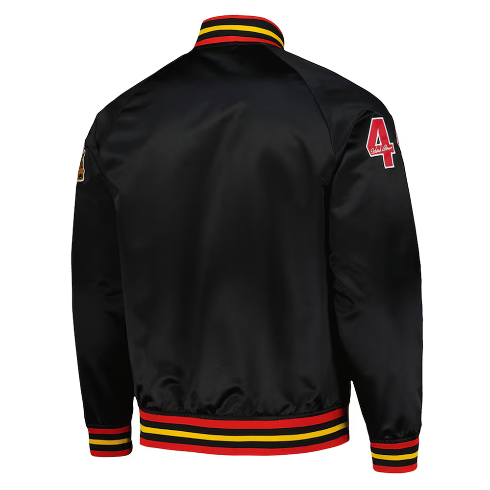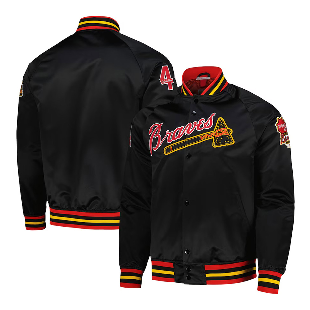 Long connecting sleeves with symbols on the surface and in the middle of the chest the “Braves” logo emphasizes your team’s identity. It is made for functionality and has a snap-tab buttoned closure with two slanted front waist pockets and an inner pocket. The nice stitch on the Milwaukee Braves Black Jacket gives it the strength needed which will stand the test of time.