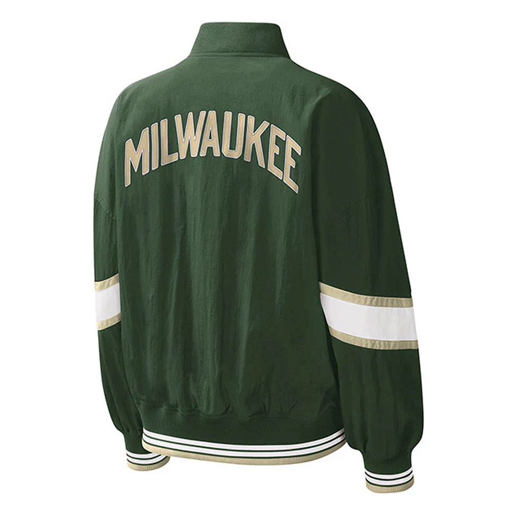 Crafted with precision stitching, every detail of this jacket exudes quality craftsmanship. Adorned with the iconic Milwaukee Bucks logo on the front and wordmark on the back, it proudly showcases your allegiance to the team.