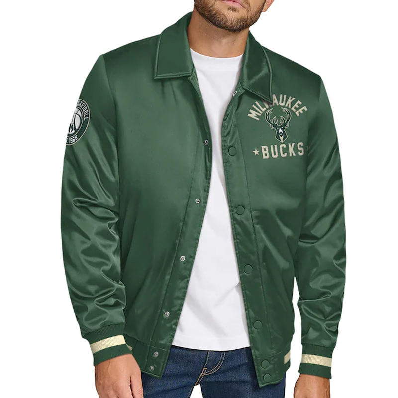 The Milwaukee Bucks Stitch Applique Hunter Green Jacket serves both women and men and it stands as a premium design for fan wear. Sporting the spirit of the Milwaukee Bucks, it combines team fandom with elegant design to become an indispensable garment for basketball fans.