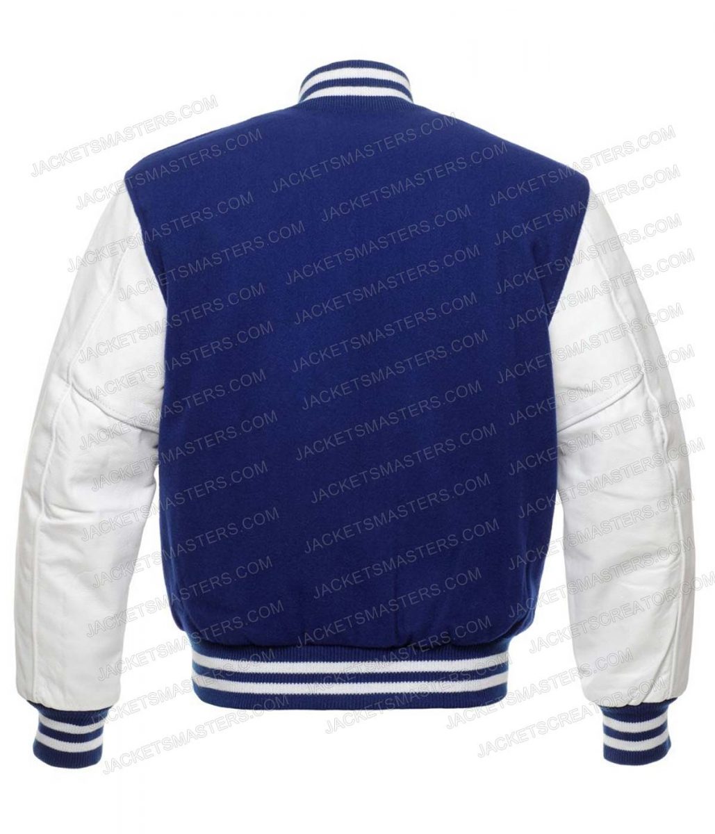 The jacket’s body is crafted from premium wool, while its sleeves are made from genuine leather, creating a durable and fashionable combination. Its white and blue color scheme adds vibrancy and uniqueness, making it a standout choice for parties, casual outings, or cosplay. Designed with a rib-knitted collar, cuffs, and hemline, it offers a sporty and fitted look.