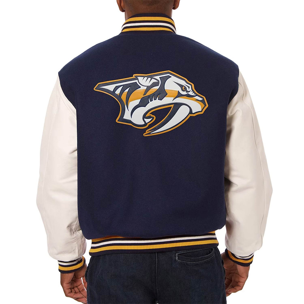 The Nashville Predators Navy and White Varsity jacket body made wool and sleeves made from genuine leather. The jacket is available in a glorious navy blue and white color combination, which gives it an innovative and attractive look. The jacket has shirt style collar. The jacket has branded YKK zipper front closure. A soft viscos inner lining of the jacket keeps you warm and relaxed. The sleeves of Navy/White Nashville Predators Two-Tone Varsity jacket are long with rib knitted cuffs. The fine quality stitching of Nashville Predators Navy and White Varsity jacket is comfortable and desirable to wear. The jacket is an ideal choice to wear on sports day.