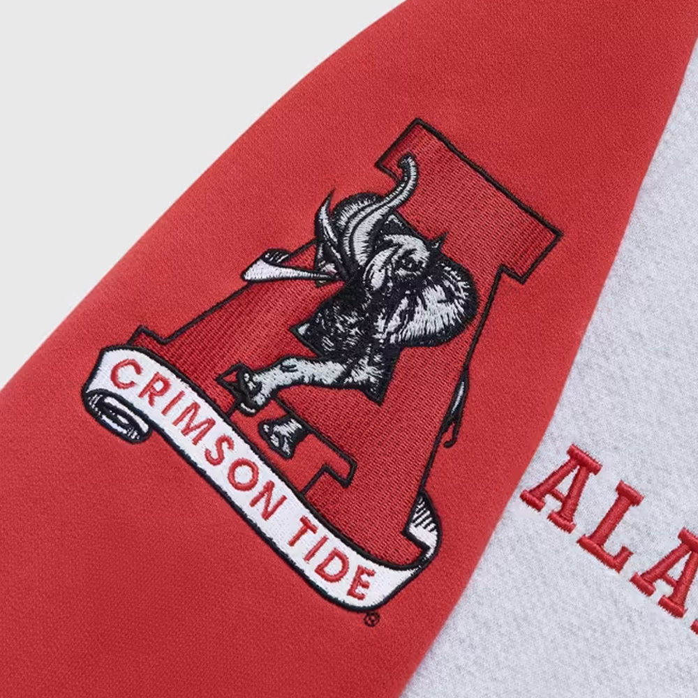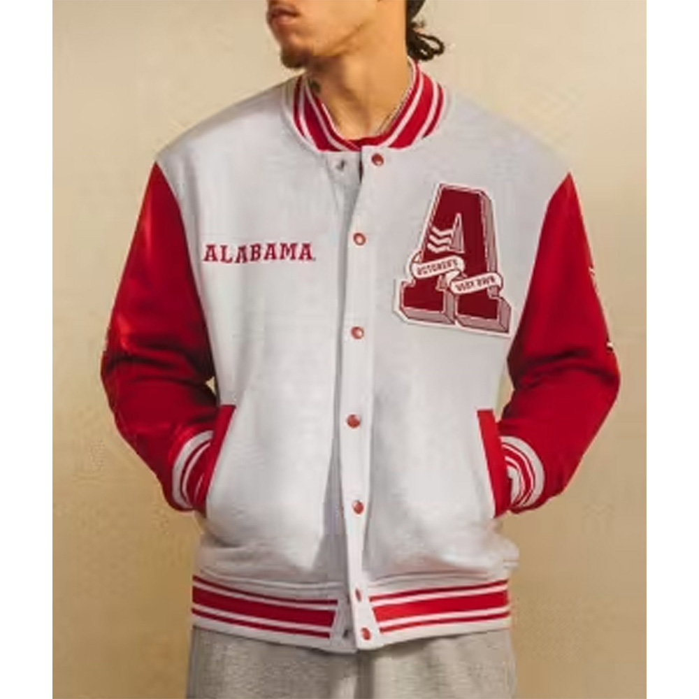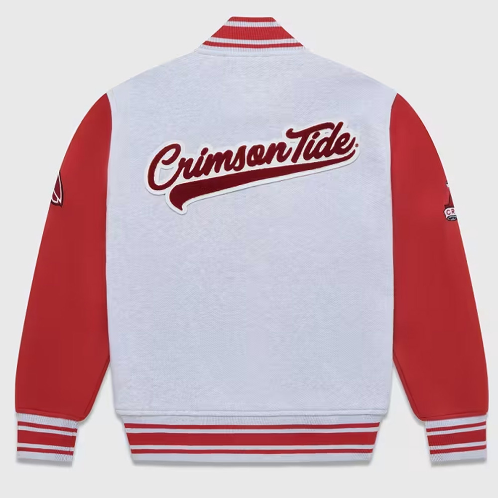 Evoke your team spirit with the OVO Alabama Jacket, a tribute to the Alabama Crimson Tide football team. Crafted from plush fleece, this varsity gem is tailored for both genders, forging a universal bond of team pride. The viscose lining ensures a lavish feel beneath the gray and red exterior. Vintage allure unfurls with a snap-tab buttoned closure, rib-knitted collar, sleeves, and hemline. Extended sleeves extend the cozy narrative, culminating in rib-knitted cuffs for an embrace of snugness. The NCAA Alabama Crimson Tide OVO Varsity Jacket proudly features the Alabama Crimson Tide graphics on the front, sleeves, and back, fostering a sporty and spirited aesthetic. Intricate stitching details affirm the jacket’s impeccable craftsmanship. As functional as it is fashionable, the OVO Alabama Jacket hosts two waist pockets on the exterior and interior, completing the ensemble with practical flair.