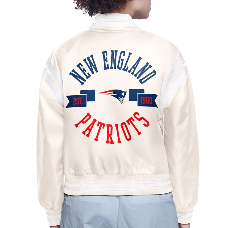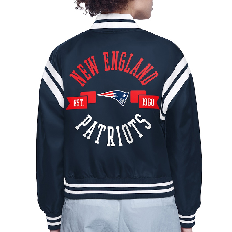On the New England Patriots Printed Logo Varsity Satin jacket, there is a rib woven collar and a snap tab front closure, which gives it a sporty yet elegant look. There are long sleeves with stripes to add a modern and lively touch to the garment that covers the arms. The rib woven cuffs and hemline give it a tailored look that still retains a comfortable, good fitting outfit.