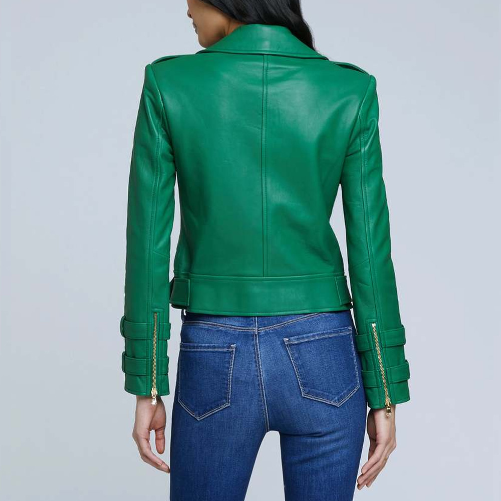 Full sleeves are equipped with a double belted cuffs; the buckle belt wrapped around the waist furnishes the Nicole Young Selling Sunset Green Leather jacket a tailored look that enhances your figure. As practical as it looks, it has two zipper front pockets and one inside pocket that give you enough space for your belongings.