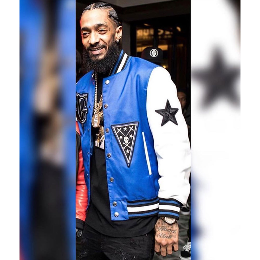 Celebrate the legacy of a music icon with the Nipsey Hussle Varsity Jacket. This statement piece blends street culture with timeless varsity fashion, giving fans a chance to channel the style of the late rap legend. Designed in a bold blue and white color scheme, it adds instant impact to any outfit.
