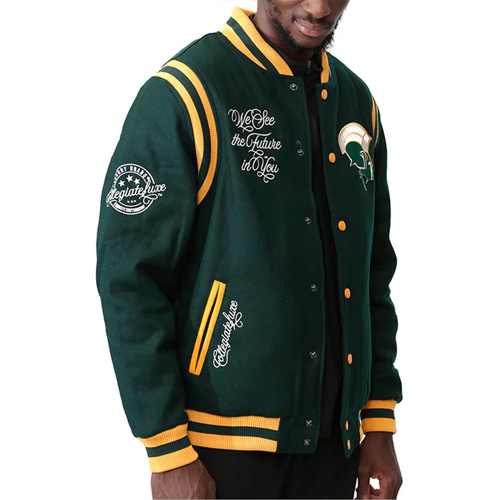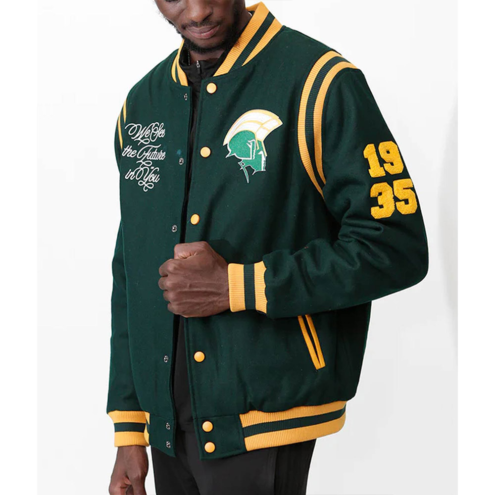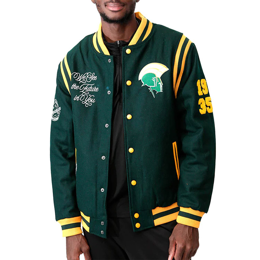 Embrace the legacy of the Norfolk State Spartans with the Varsity Green Wool Jacket, a unisex piece that encapsulates the spirit of the university. Crafted with meticulous artistry, the premium wool material exudes a sense of tradition and sophistication. The vibrant green color pays homage to the Spartans’ colors, showcasing your team loyalty with pride. The rib-knit collar and full-snap front closure blend functionality with style, allowing you to adjust your look effortlessly. The rib-knit cuffs and hemline provide a comfortable fit and an extra layer of warmth. Adorned with the Norfolk State University emblem on the chest, this jacket speaks volumes about your allegiance. The two side pockets offer practicality while maintaining the sleek design. Whether you’re cheering from the sidelines or stepping out in style, the Norfolk State Spartans Varsity Green Wool Jacket lets you showcase your team pride with elegance.
