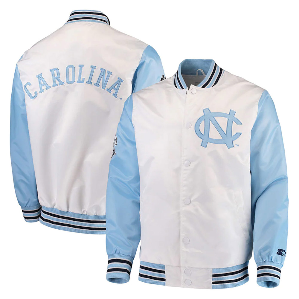 The North Carolina tar heels the rookie jacket is constructed from premium satin. The interior of the jacket’s viscose lining regularly provides flair and comfort. The style has a conventional front with a knit collar and a buttoned fastening. It has two side waist pockets to keep things organized. This also has a striped waistline and rib-knitted cuffs. It has a distinctive appearance thanks to the word “Carolina” stitched on the back and the logo on the front and sleeve. The North Carolina tar heels blue and white jacket’s perfection is enhanced by the high caliber of its stitching. a great option for everyday use and frequent outings.