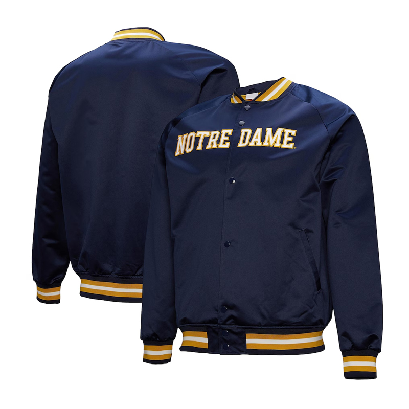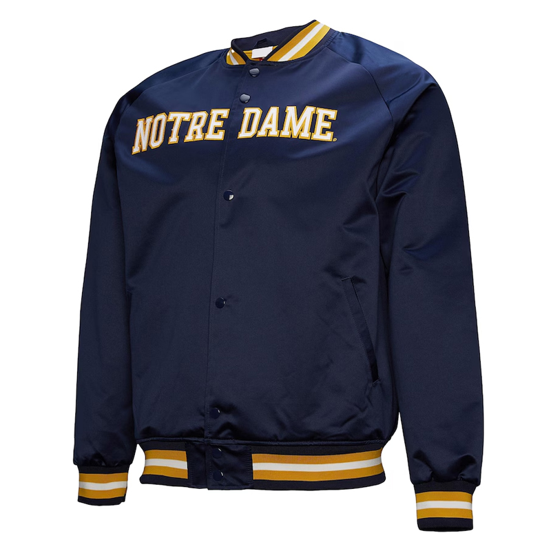 Improve your game day spirit with this Notre Dame Fighting Irish Current Logo Lightweight navy satin Jacket that fits both men and women who love supporting the great football team. Designed with smooth and glossy navy satin lining, this jacket is both comfy and fashionable. The inner lining of viscose material makes it comfortable to wear all day long.