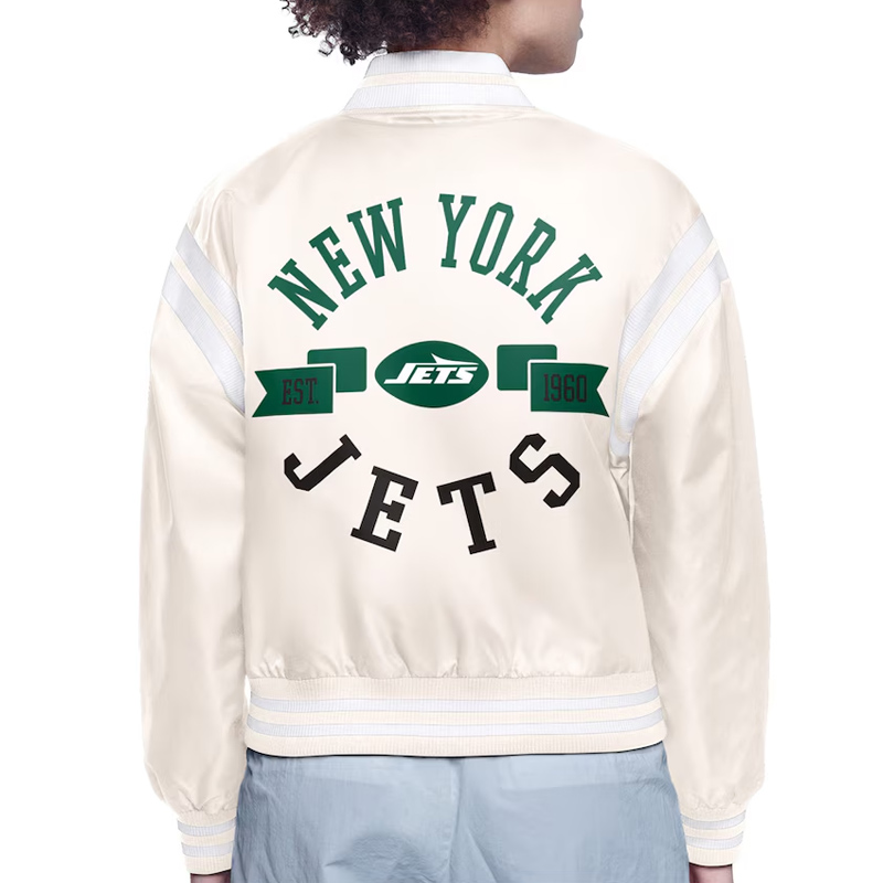 Be proud of your New York Jets by wearing this New York Jets team logo jacket that is finely made and will match your other fan merchandise. Design for both men and women. This jacket is finely tailored using satin material which gives it a classy and light weight finish. The interior is made of soft viscose fabric which will make you feel comfortable during the whole day.