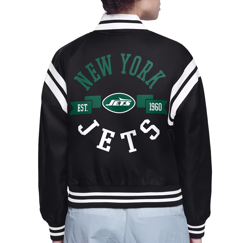 This New York Jets Printed Logo Varsity Satin jacket is available in an appropriate black color which makes it suitable for any occasion at any time of the year. It has a rib-woven collar that adds an elegant look. The snap tab on the front closure ensures that it is well closed with ease thus providing a secure way of closing it, the long sleeve with stripes on it adds some sporty look. The rib-woven cuffs and the hemline provide a perfect fit to the body besides increasing the general durability of the jacket.