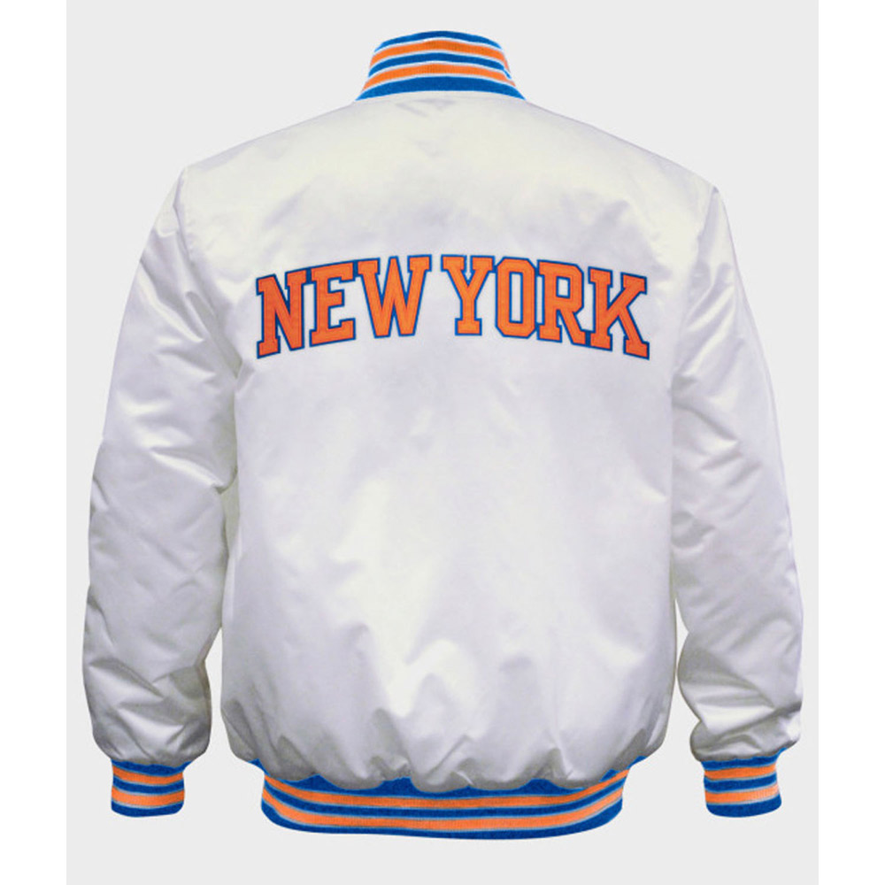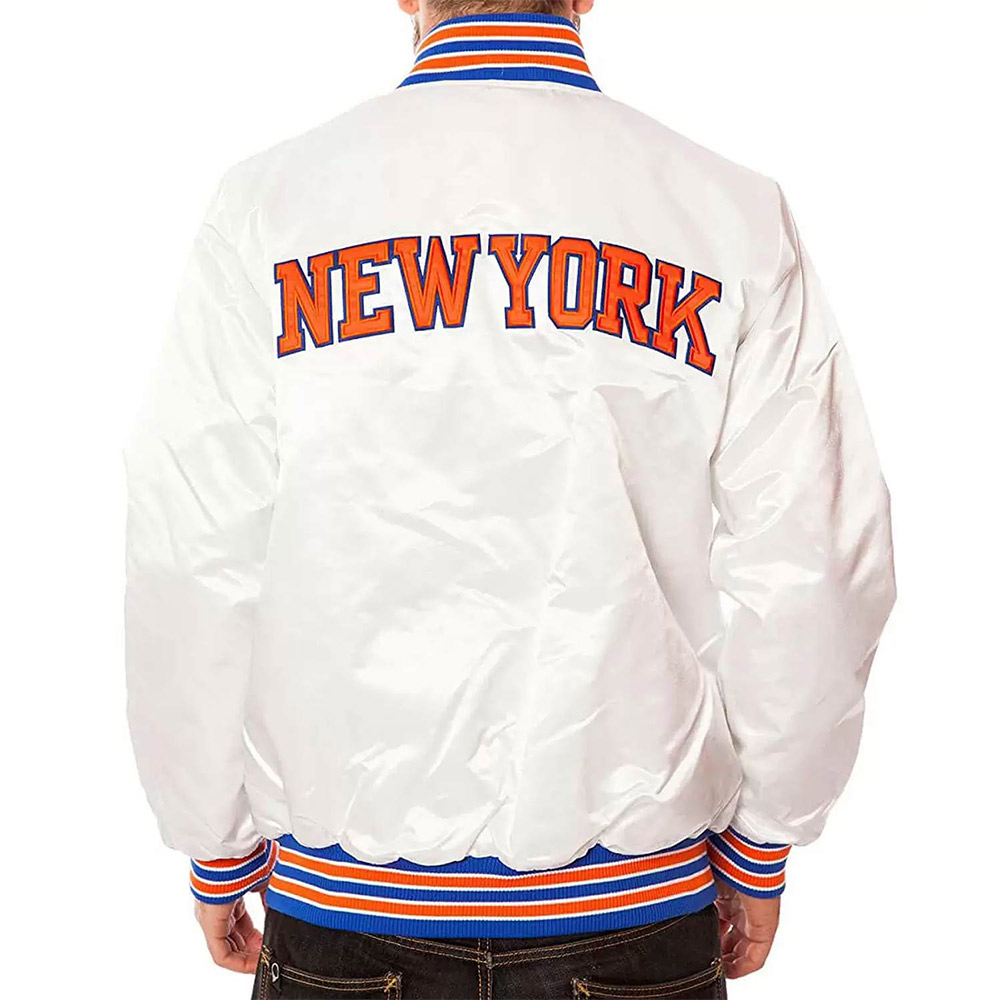 The New York Knicks white jacket features comforting satin fabric that both genders can carry. It’s available in a compelling white color, attracting viewers. There is a soft viscose lining inside, which will keep the wearer in their comfort zone. This jacket has a rib-knitted collar and hemline, keeping it feasible to carry casually. The snap-tab buttoned Closure of the New York Knicks white satin jacket is the most convenient feature. The long sleeves are fitted at the end with rib-knitted cuffs. There are two pockets outside and inside pockets, providing enough storage space. The New York Knicks logo on the front and back will make you stand out.