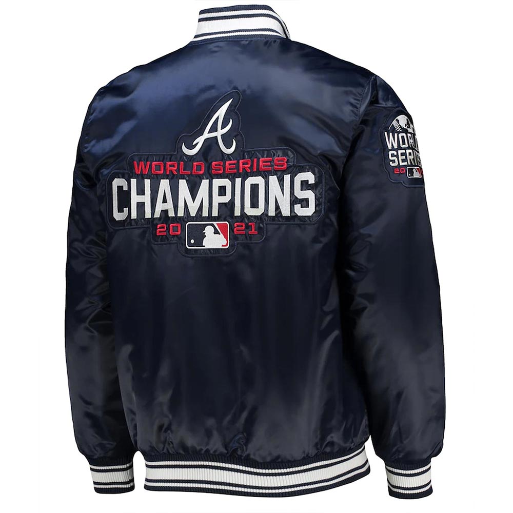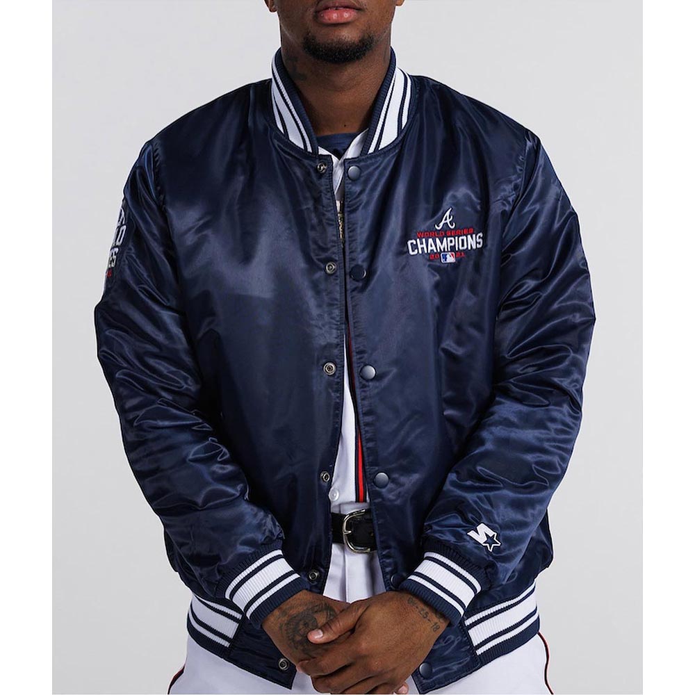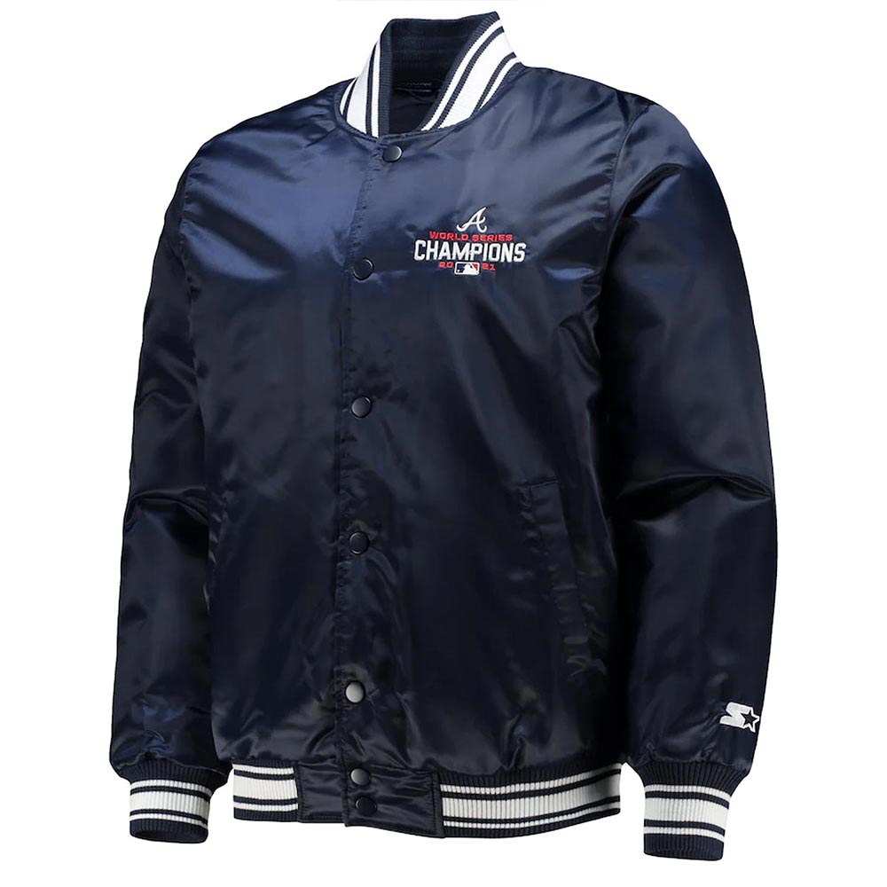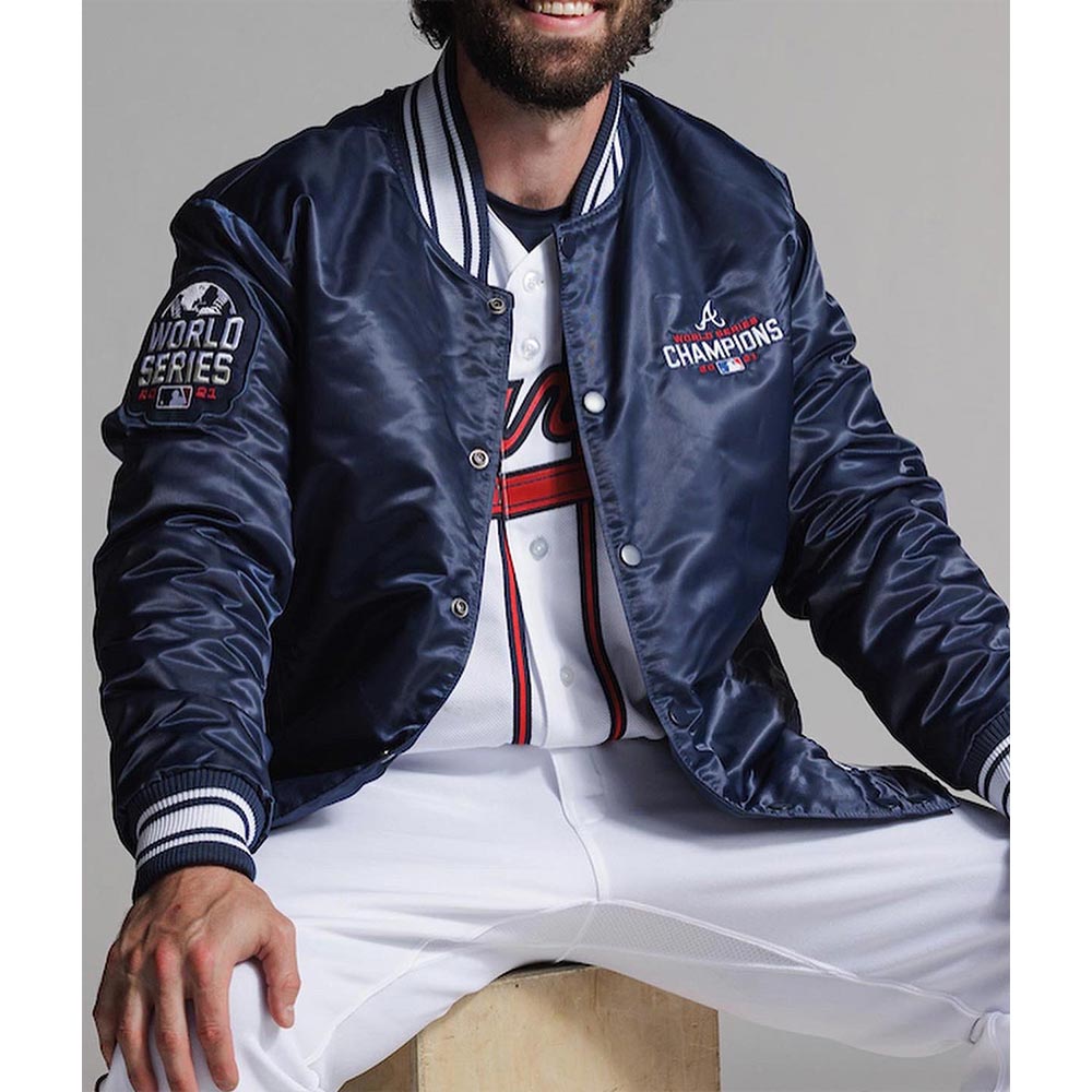 The Atlanta Braves World Series Champions 2021 jacket is made up of high-quality satin. The jacket is available in a glorious navy-blue color, which gives it an innovative and attractive look. The jacket has rib knitted collar. The jacket has buttoned front closure. A soft inner viscose lining of the jacket keeps you warm and relaxed. The sleeves of World Series Champions 2021 Atlanta Braves jacket are long with rib knitted cuffs. The jacket has two inner and two side pockets. The fine quality stitching Atlanta Braves World Series Champions 2021 jacket makes it durable and desirable to wear. The jacket is an ideal choice to wear in parties.