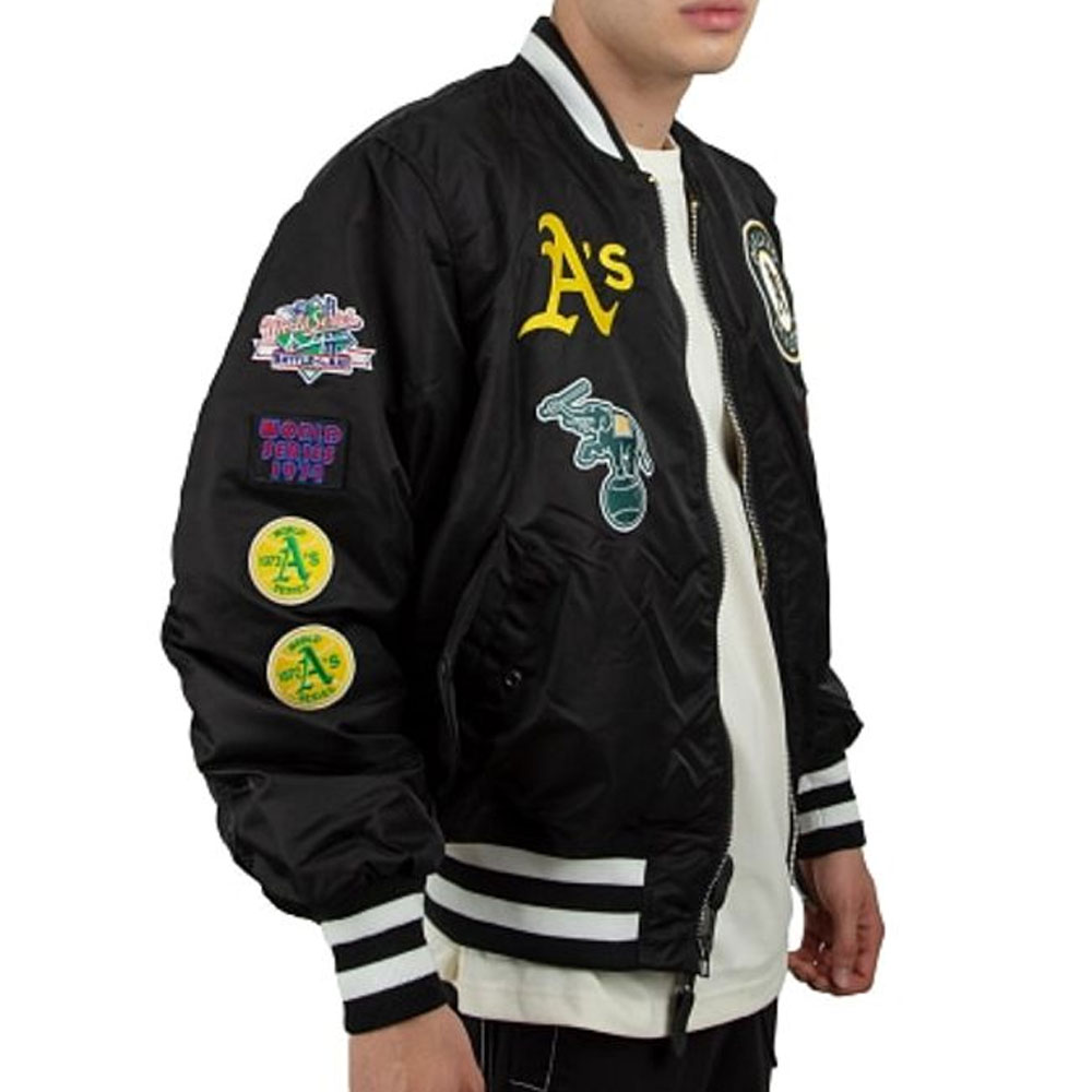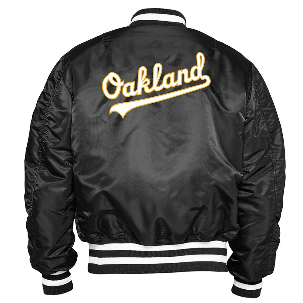 Embrace the allure of the Oakland Athletics MA-1 Bomber jacket, meticulously crafted from satin. Its striking black color brings forth an innovative and striking aesthetic. Sporting a rib knitted collar and branded YKK zipper front closure, this Oakland Athletics Bomber MA-1 jacket seamlessly blends style and functionality. The soft viscose inner lining ensures warmth and relaxation. With long sleeves adorned with rib-knitted cuffs, a comfortable and sophisticated fit is guaranteed. The Oakland Athletics MA-1 Bomber jacket boasts two inner and two side pockets, providing ample storage options. Experience comfort and desirability with its fine quality stitching, making it the perfect choice for parties.