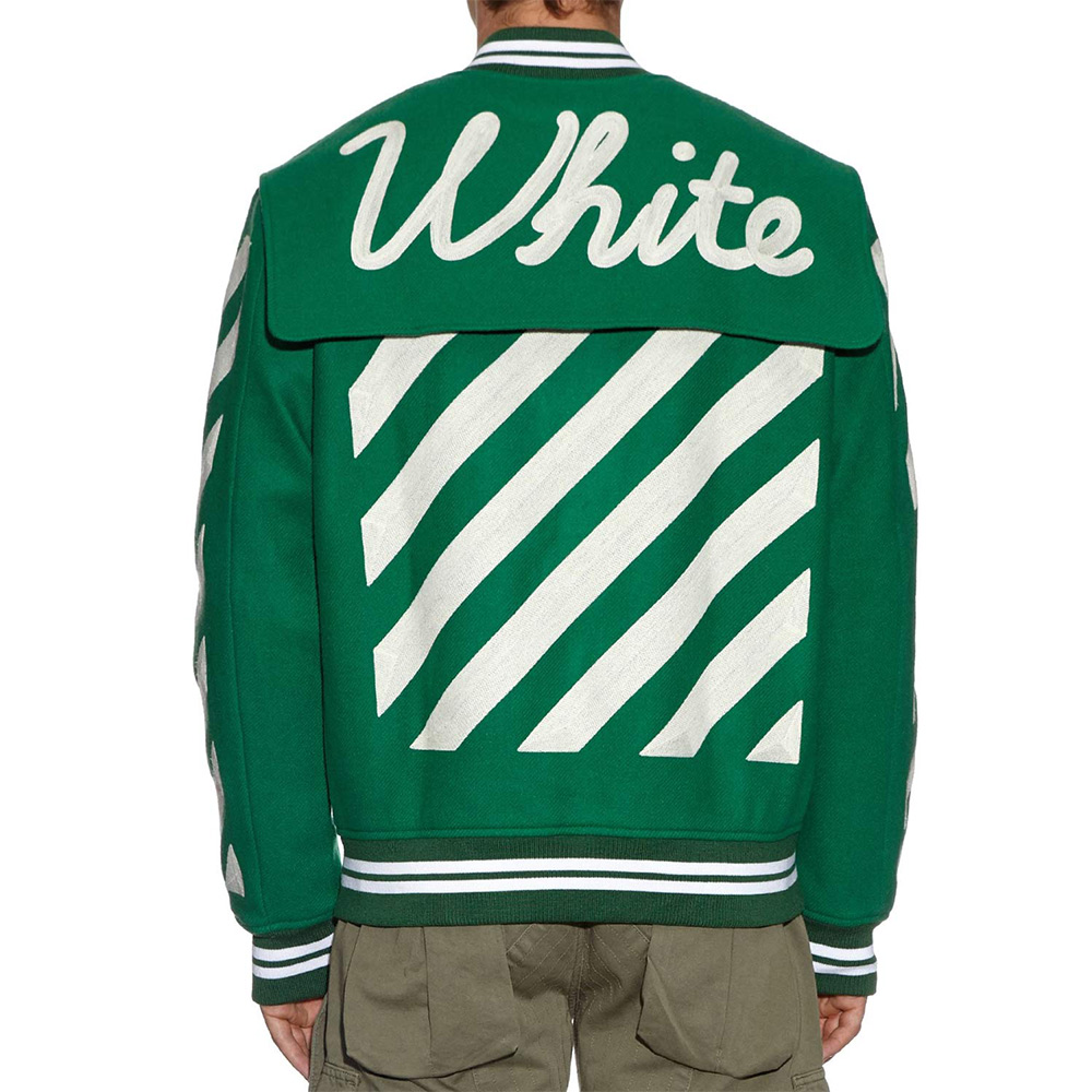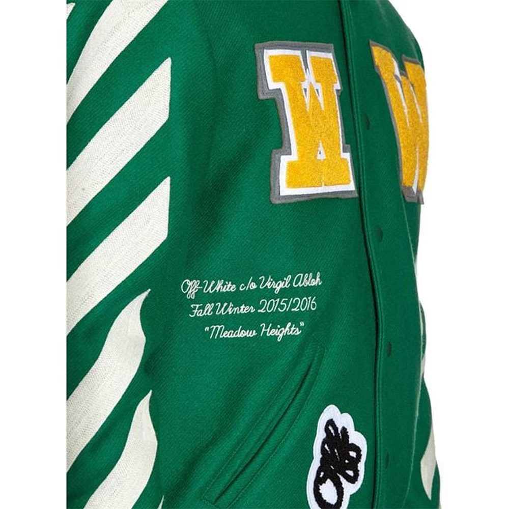 The Off-White Green Varsity Jacket is tailored from high-quality wool, offering both warmth and durability. Its vibrant green color adds a striking touch that stands out in any setting, making it a versatile addition to modern wardrobes. The rib-knitted collar and full-snap buttoned front closure enhance its classic varsity silhouette, while fine stitching ensures long-lasting wear.