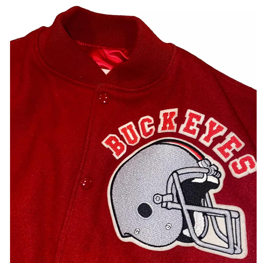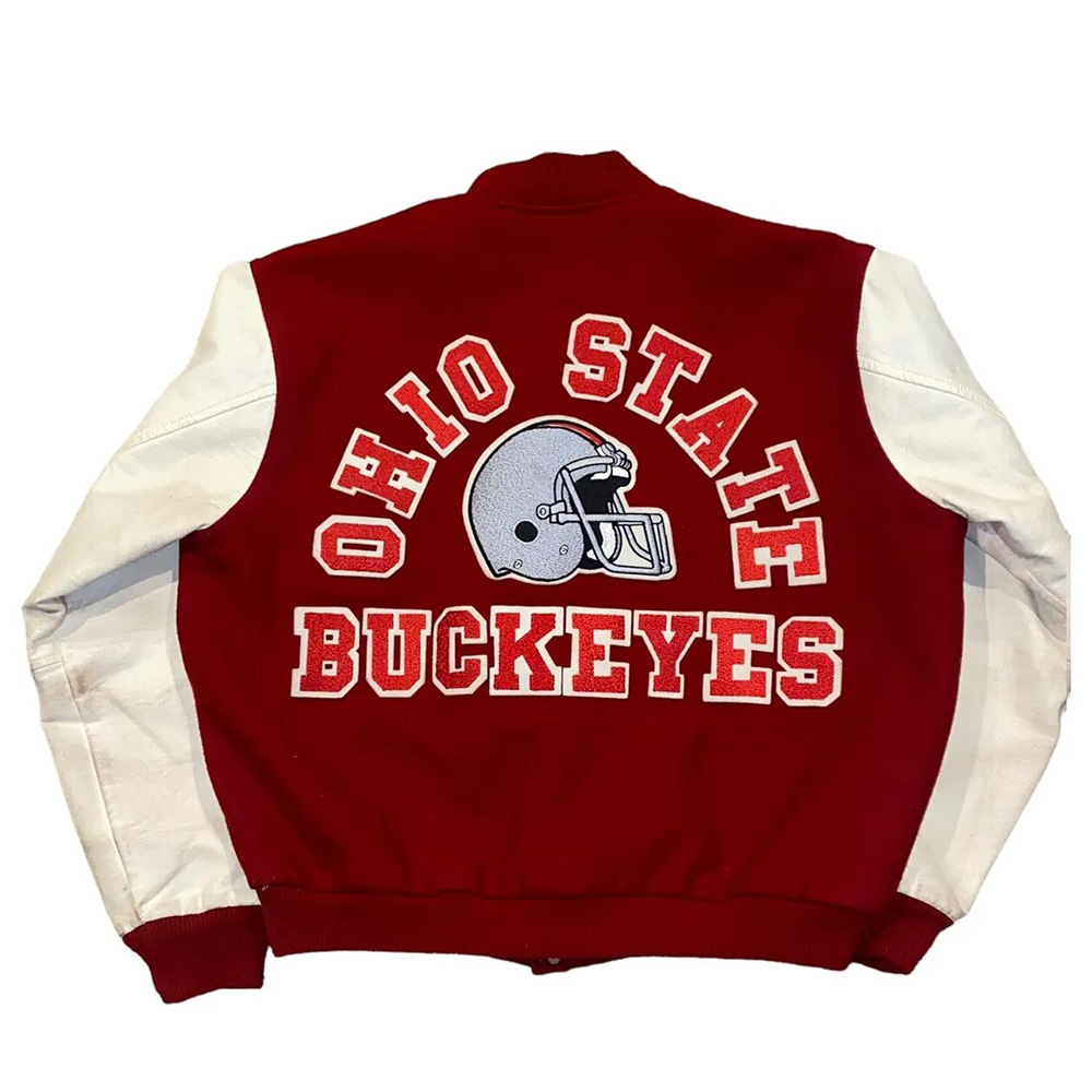 The most memorable aspect of this jacket has the Ohio State Buckeyes emblem and large letters “Buckeyes” on the front, with clear reference to your favorite team. There are two slanted waist pockets and an additional inner pocket. Perfectly tailored and stitched the Ohio State Buckeyes Varsity Jacket is the preferred piece of wear for any fan.