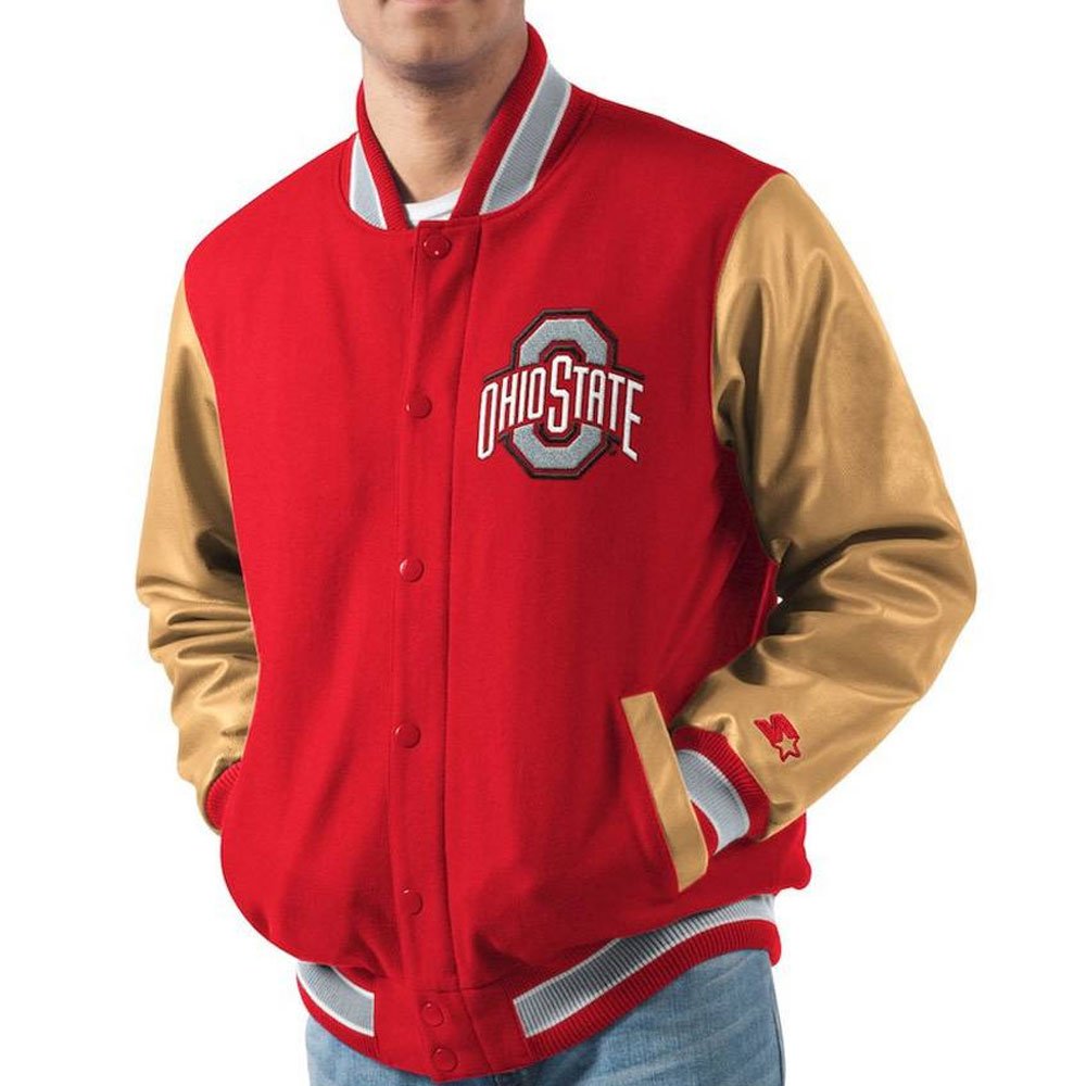 The Ohio State Buckeyes Red Varsity jacket body made wool and sleeves made from genuine leather. The jacket is available in glorious red and beige color combination, which gives innovative and attractive look. The jacket has shirt style collar. The jacket has branded YKK zipper front closure. A soft viscous inner lining of the jacket keeps you warm and relaxed. The sleeves of Ohio State Buckeyes Varsity Red and Beige jacket are long with rib knitted cuffs. The fine quality stitching of Ohio State Buckeyes Red Varsity jacket is comfortable and desirable to wear. The jacket is an ideal choice to wear on sports day.
