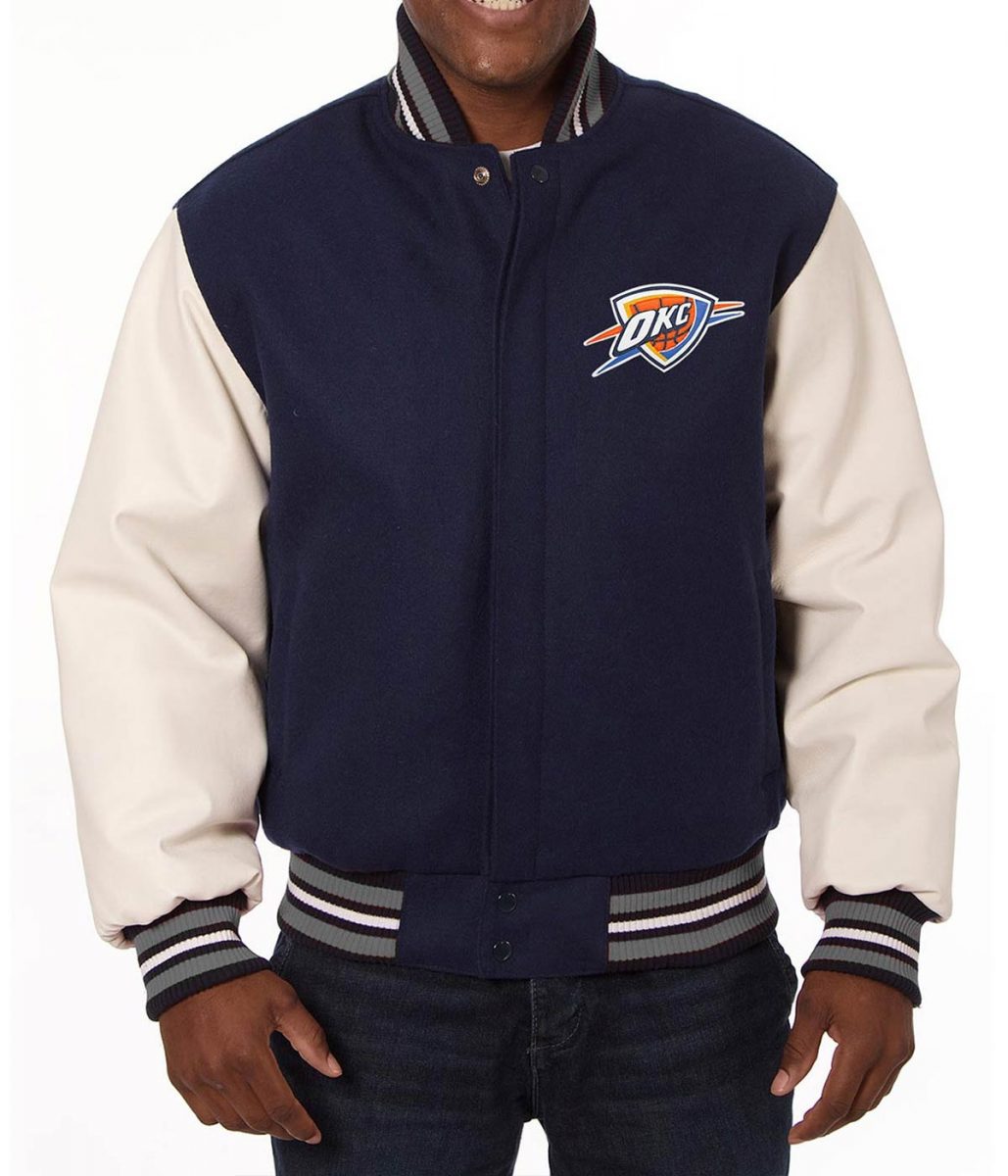 The Oklahoma City Thunder blue and white varsity jacket Body made wool and Sleeves made from Genuine leather .The jacket is available in a blue and white color, which gives it an innovative and striking look. The collar of the jacket is a rib-knitted style. It has a classical snap tab style front closure. A soft viscose inner lining of the jacket keeps you warm and relaxed. The sleeves of Oklahoma City Thunder varsity blue and white jacket are long ends with rib-knitted cuffs. The jacket has two side waist pockets for keeping stuff. The fine quality stitching of the Oklahoma City Thunder blue and white varsity jacket makes it durable and desirable to wear. The jacket is an ideal choice for stylish men and women.