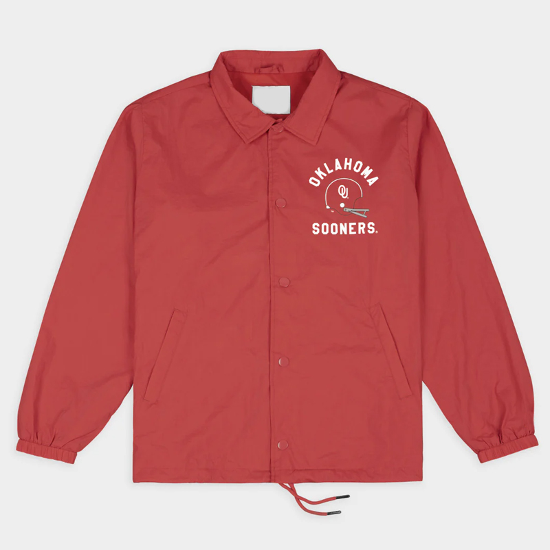 The shirt style collar gives it a timeless appearance yet the snap-tab opening allows convenient put-on and removal. The long sleeves with elastic cuffs provide flexible sleeve positioning. This Oklahoma Sooners Coaches Football Retro Helmet Jacket combines fashionable features with practicality through its two slanted waist pockets for instant use combined with two alternate storage pockets inside. The front display of the Oklahoma Sooners logo highlights team loyalty along with the back placement of the University of Oklahoma lettering.